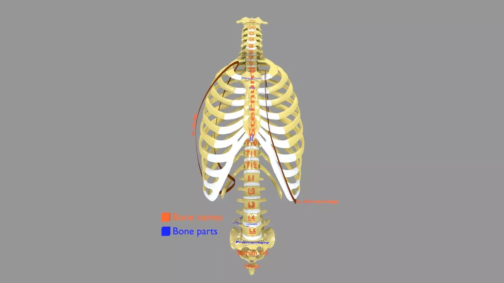 A 1:1 scale model of ribs and vertebrae with individual name of bones along with parts of a rib and vertebrae. The material has image textures and normal maps on non-overlapping UVs.The formats 3mf, ply, obj, fbx, USDZ,GLTZ & GLB with applied uv mapped textures have also been included in the downloads along with stl.