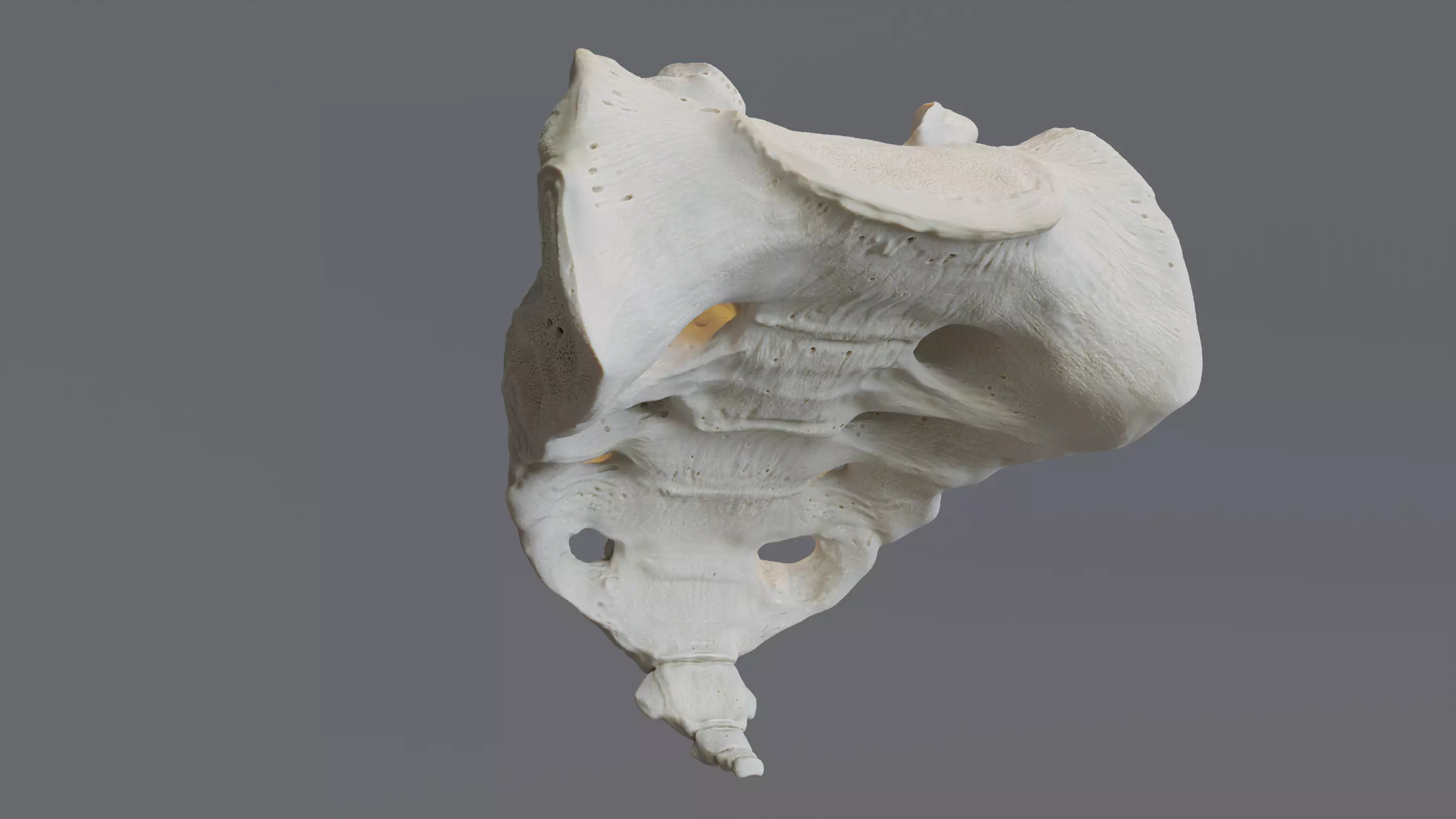 A 3D model of a human female sacrum. The original base CT scan data of the sacrum was from a young (20-30s) female.