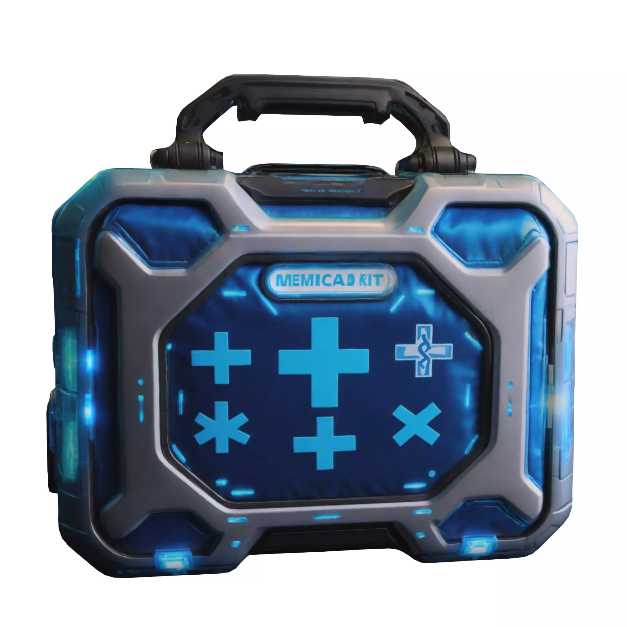 This 3D model showcases a detailed sci-fi medical kit with glowing blue highlights and a modern, tactical design. Ideal as a health pickup, medkit, or healing item in futuristic or cyberpunk-themed games. Fully optimized and compatible with leading game engines such as Unreal Engine, Unity, and Godot.