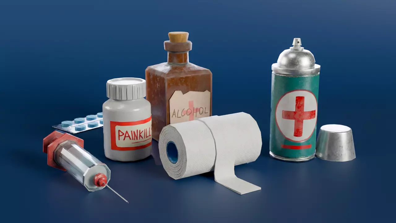 3d model, medical, first aid, survival, health, stylized, cartoon, low poly, game ready, mobile game, pharmacy, hospital, loot, inventory, bandage, syringe, pills, drugs, alcohol, medicine, kit, emergency, doctor, prop, asset, blender, fbx, obj