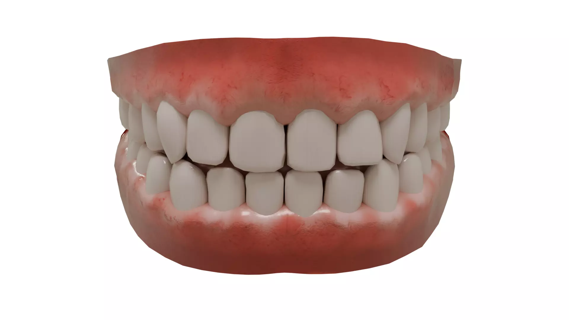 Develop a highly detailed 3D model of human teeth and gums, emphasizing anatomical accuracy and realistic textures. Include individual teeth with precise structure, such as molars, canines, and incisors, alongside natural gum contours and textures. Ensure the model captures fine details like enamel, grooves, and gum tissue for use in dental education, animations, or visual effects. The model should be suitable for close-ups and medical visualizations.