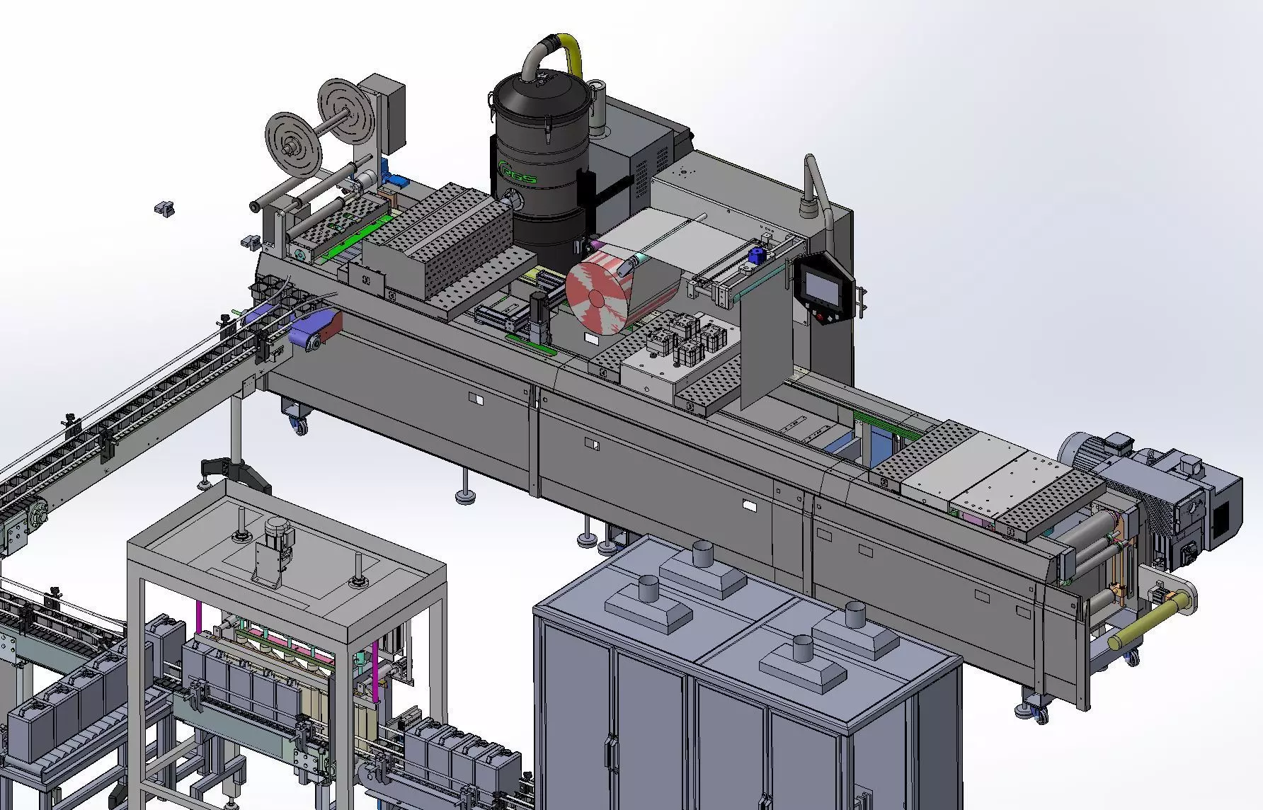 This thermoform machine is a high-efficiency packaging system that integrates heating, forming, and sealing processes. It shapes rigid plastic sheets using form molds and hygienically seals the product within the packaging. The system operates exclusively with rigid cutting molds and is capable of running up to 4 different molds.