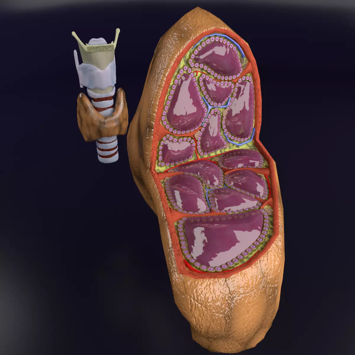 3d model in blend file of Thyroid along with its relation with trachea and larynx. Microscopy of thyroid including its follicles, colloid, follicular cells, parafollicular cells, trabeculae, capsule and blood vessels are detailed along with labels. The textures are uv mapped and non-overlapping. A model for science and medical lovers.The formats 3mf, ply, obj, fbx, USDZ,GLTZ & GLB with applied uv mapped textures have also been included in the downloads along with stl.