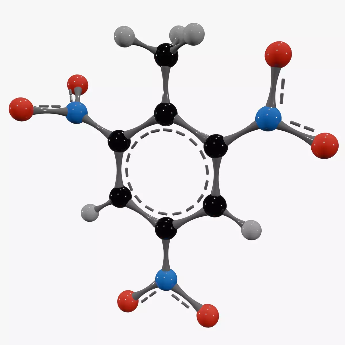 This TNT Molecule 3D model represents 2,4,6-trinitrotoluene, a well-known nitroaromatic compound with the formula C7H5N3O6. Its structure features a benzene ring with three nitro groups and a methyl group attached, making it highly explosive and widely recognized in military and demolition applications. This model is suitable for educational visualization in chemistry, materials science, and energetic compounds research.