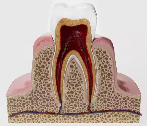 Originally created in Cinema 4D and rendered with Redshift, the model features clean topology and detailed internal anatomy, including enamel, dentin, pulp, nerves, blood vessels, and surrounding bone structure.
