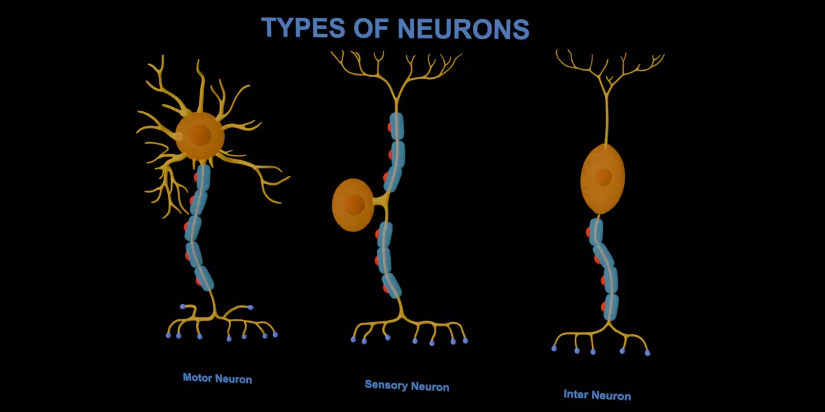 A clear and stylized 3D illustration showing the three major types of neurons: Motor Neuron, Sensory Neuron, and Interneuron. Ideal for biology presentations, teaching materials, student projects, and scientific visualization.
