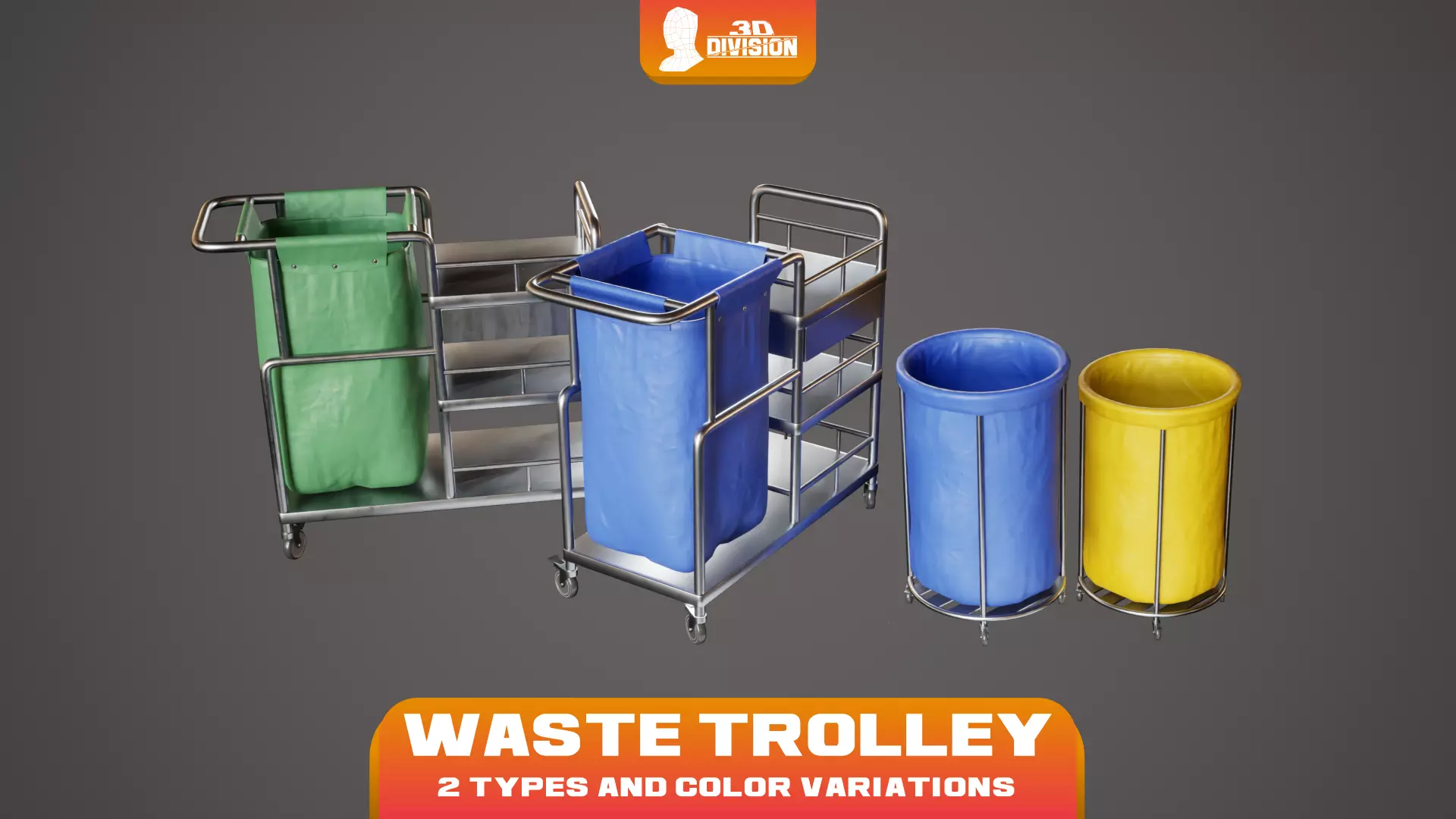 Low-poly, game-ready Hospital Waste Trolley with 2 mesh variations and real-time color customization via shader masks.