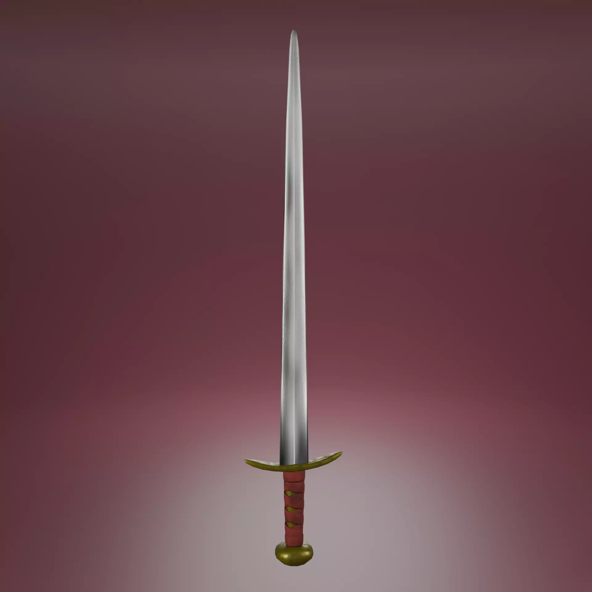 This is a stylized medieval sword, modeled with clean topology and optimized for game engines. The model features a slightly curved blade with a worn metallic texture, a red leather-wrapped grip, and golden guard and pommel details, giving it a heroic and fantasy-inspired aesthetic.
