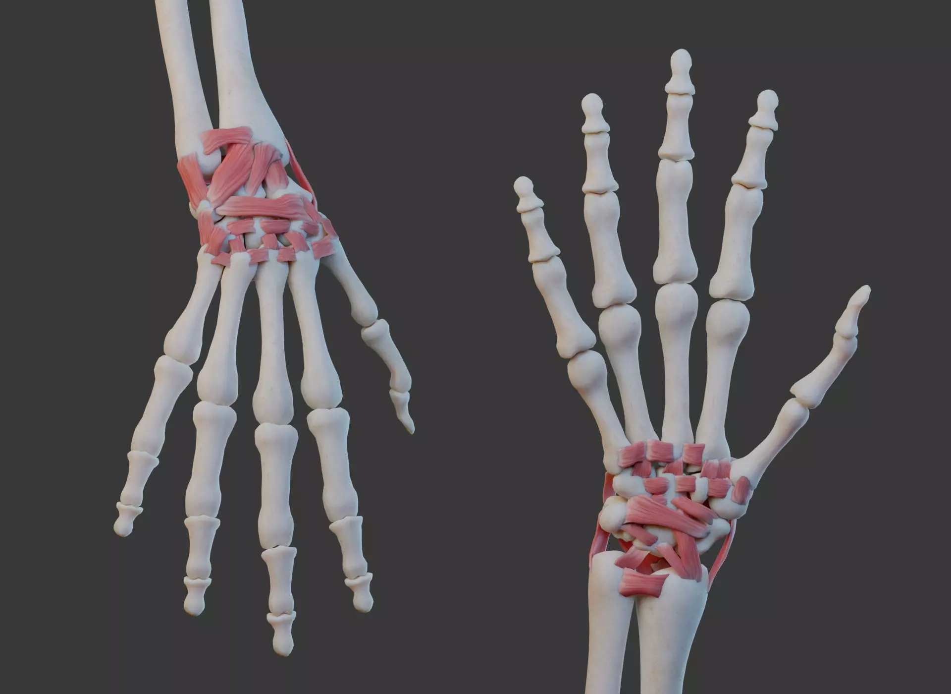 Life-sized, anatomically correct human wrist joint, including bones and ligaments.UV unwrapped with non-overlapping islands. Includes realistic color and normal maps for bones and ligaments.The base mesh is visible in wireframe preview images; textured preview images show the model with one level of subdivision applied. Full model (without subdivision) contains 25,496 vertices and 24,558 polygons.
