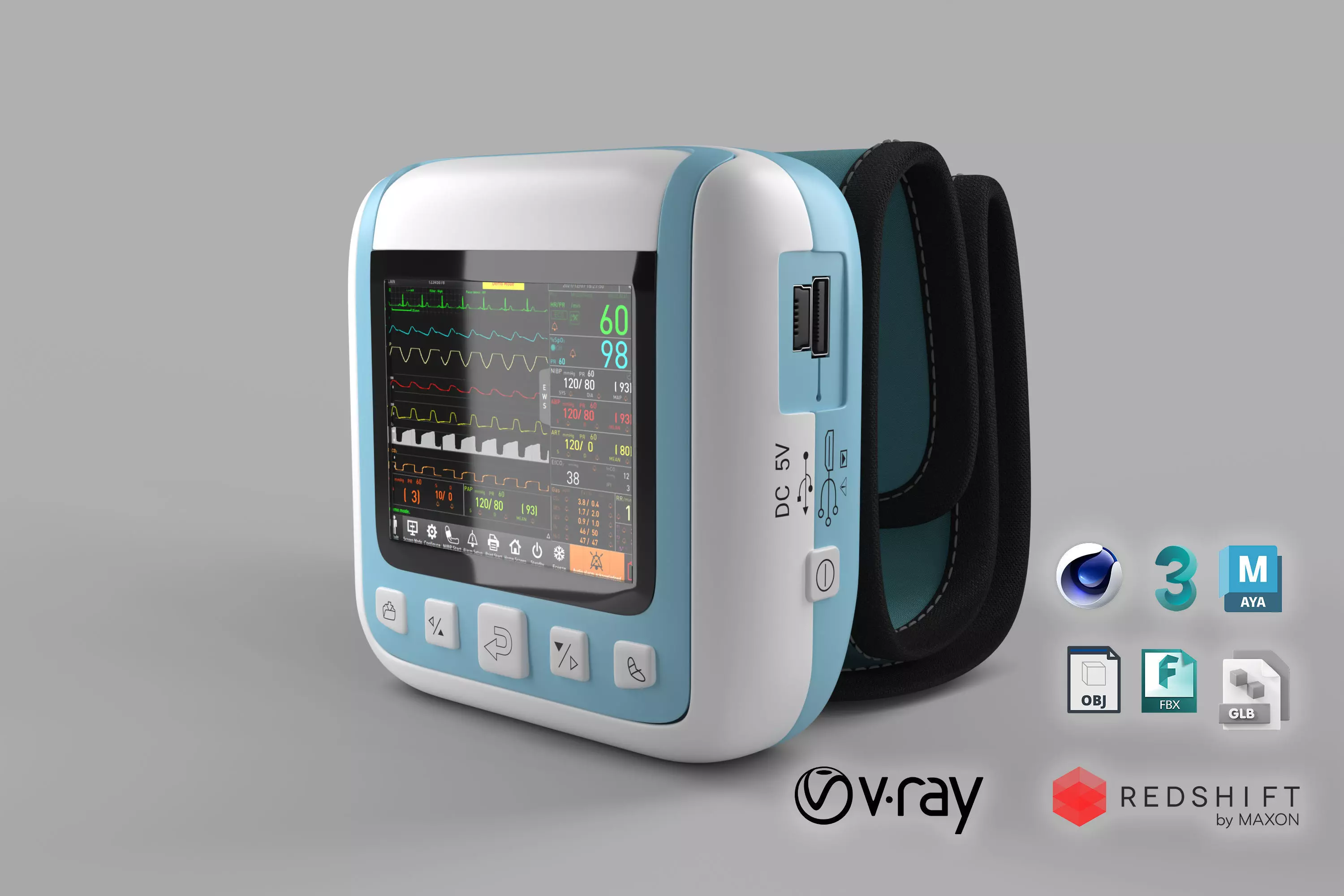 This is a WRIST PATIENT MONITOR device modeled originally inside of Autodesk Maya 2023 and exported into 3ds Max 2022. This device is used for monitoring patients' blood pressure in the medical field.The textures have been edited inside adobe illustrator with masks exported to help buyers see the UVs and the UV mesh map outs are included just incase you wanted to change to the buyer's desire. The render shots were made primary inside Autodesk Maya 2022 using redshift.Some of the final render shots were made inside of 3ds Max 2022 with Vray 6 Hotfix 2. if you have a problem withthe models please contact me on tiktok albypayne and I can get back to you specifically for that purpose.