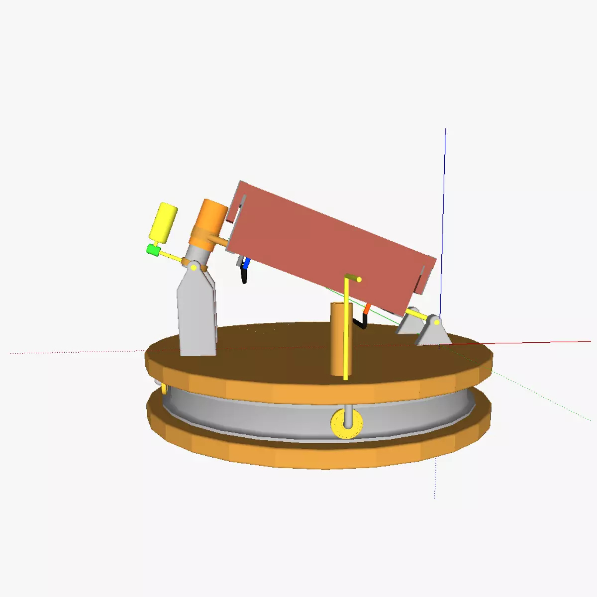 3D model of the AT solar thermal collector type 1. The type 1 is a batch heater. The batch heater design was based on Michael Reynolds’ DIY batch heater (see Earthship Volume 2: Systems and Components). A platform was added to allow 360 degrees horizontal rotation, aswell as a piston to allow 90 degrees vertical rotation. The pump that can add/remove oil into the piston for the heightening/lowering thereof can be made manually-operatable. The platform too is manually operated; ie the platform needs to be pushed by means of the yellow handlebar on the platform. The pin can be manually lifted/lowered to secure the platform once correctly aligned to the sun. The entire system is mostly intented to allow the batchheater to be set for a specific time of day (so as to not require continuous resetting during the day, as the sun turns from east to west). The batch heater can be set ie for a specific time of day when the owner of it usually takes a shower, does the dishes, … (depends on what the collector is used for). See the 'Purchasing_the_models' link at appropedia's AT_CAD_Team for additional information on the model