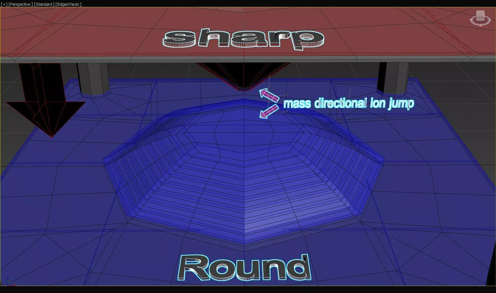 by charging the top plate with the downward points (spikes) in its geometry, we can build up an equal potential maximum charge, up to right before the ion jump starts to occur, then because of the geometry (and lattice placement) of the points, we know where exactly the local charge build ups occur, and where specifically, the discharge and ion jump, towards the more rounded off geometry will occur.