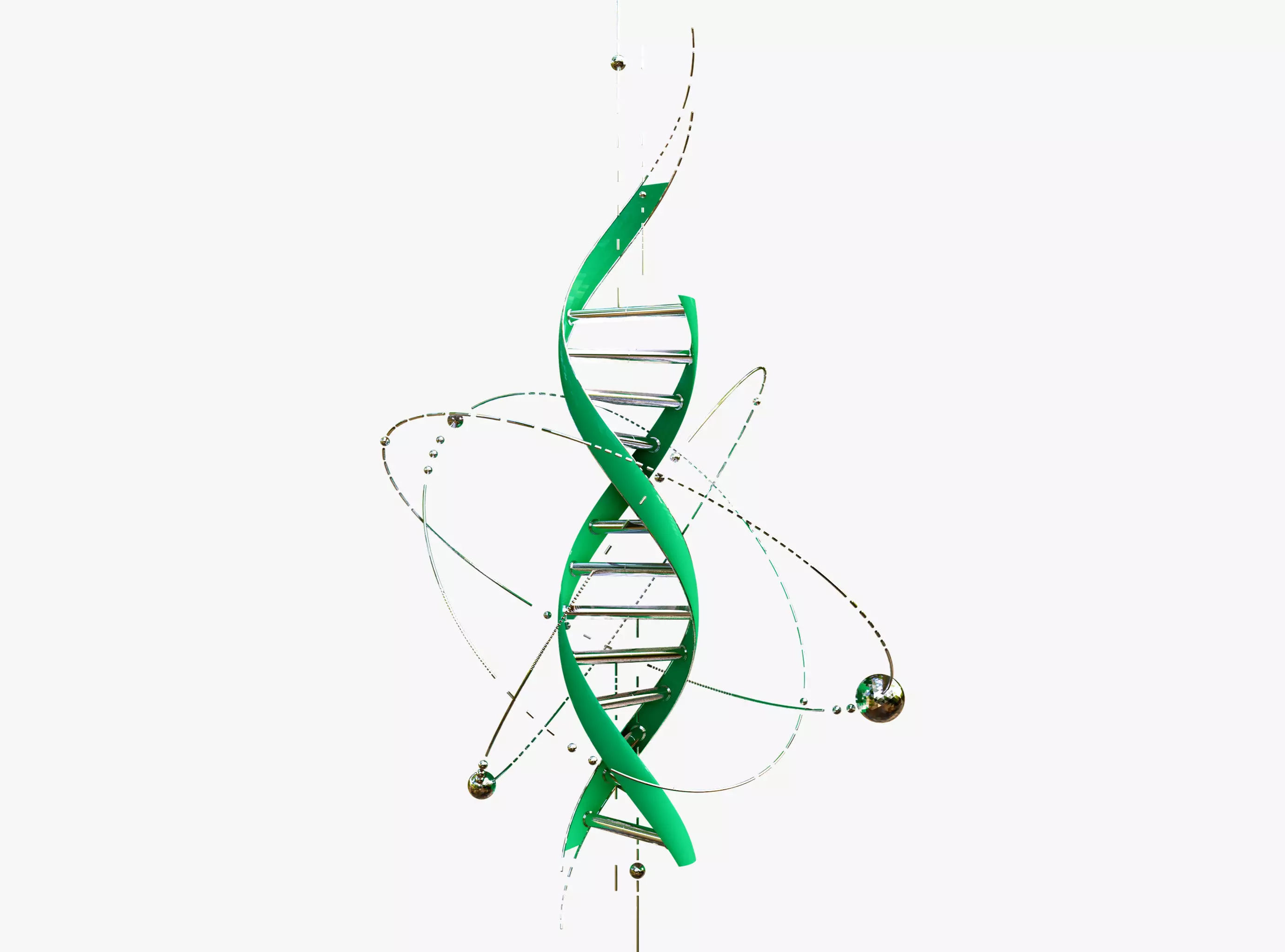 Futuristic techno-style stylization of a DNA molecule. The composition is based on a double helix in a rich emerald green color, with coils connected by chrome cylindrical bridges. The structure is surrounded by thin metallic orbits with mirror spheres, creating a visual association with atomic structure or particle movement.