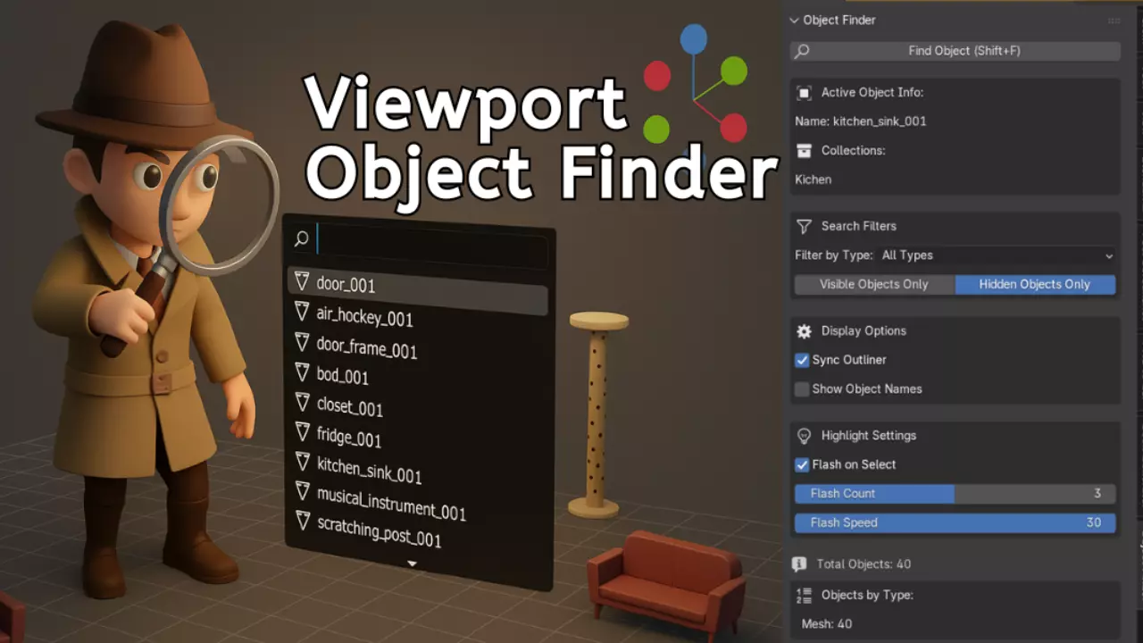 The Viewport Object Finder is the essential productivity addon for every Blender artist. If your scene has 10 objects or 10,000, finding the right one should take seconds, not minutes. This addon makes that possible.