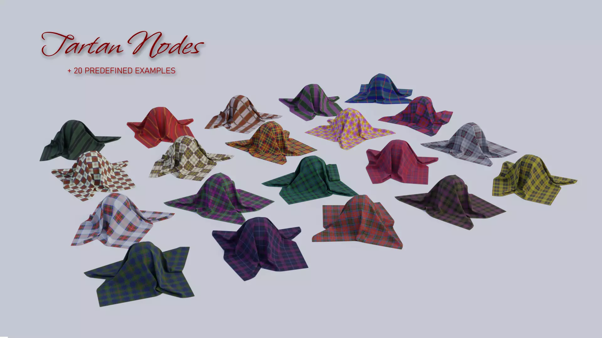 The tartan nodes are 4 group material nodes to create infinite tartan and scottish fabric patterns and 20 predefined examples.