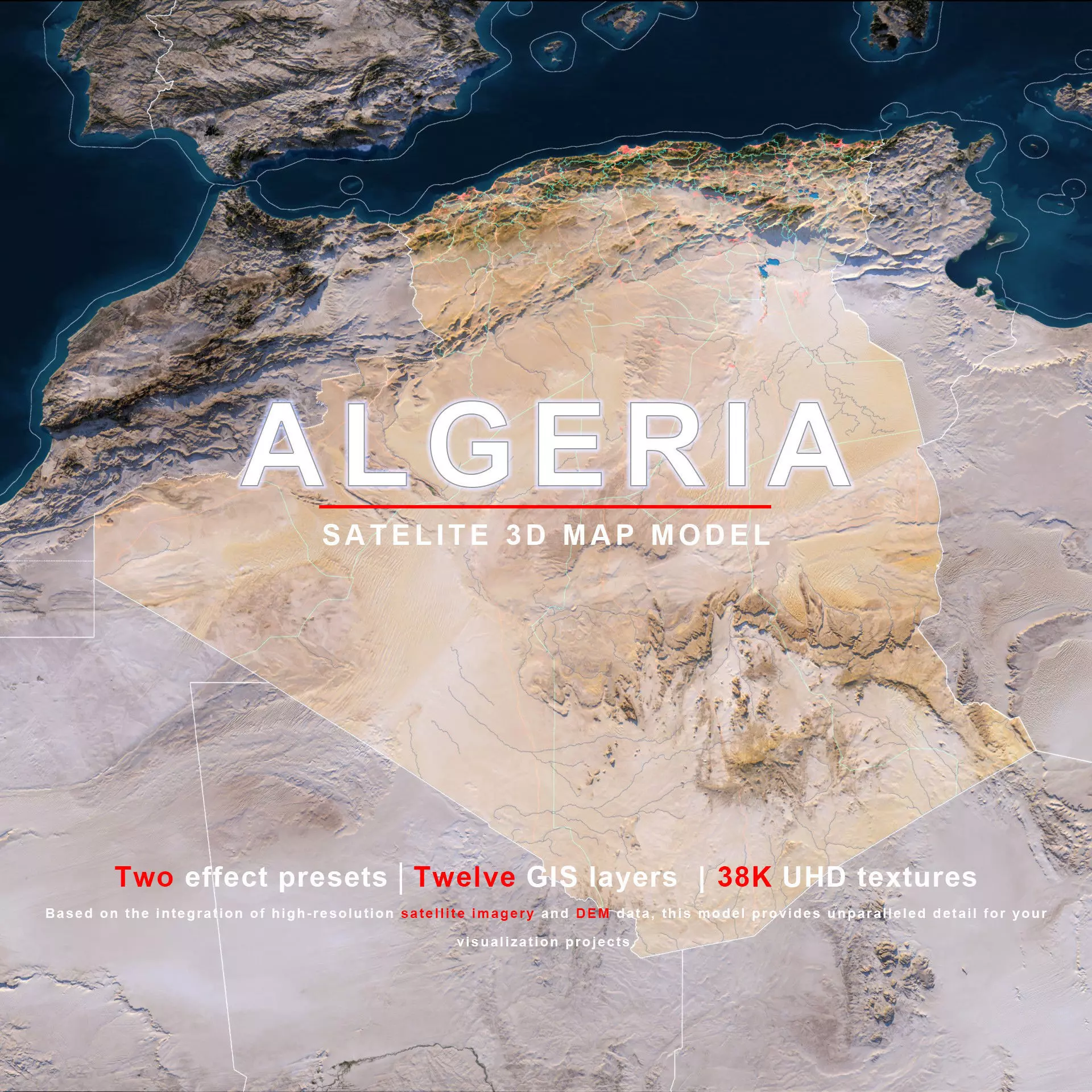 The model includes satellite imagery and masks. The masks are primarily used in material blending to adjust the material representation based on different geographical data. We provide texture maps in both 8K and 38K resolutions.
