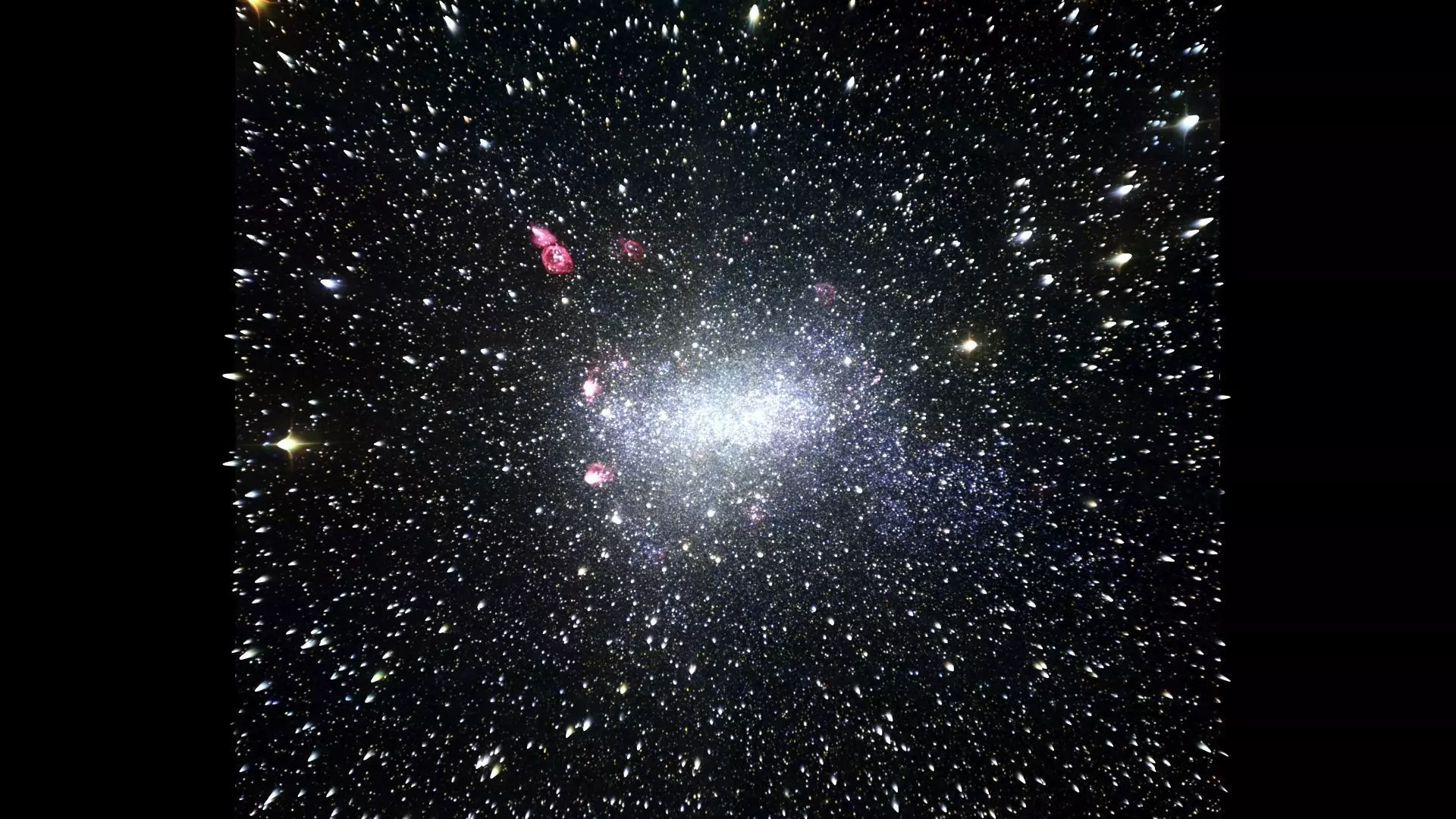 DescriptionBarnard's galaxy (also known as NGC 6822, IC 4895, or Caldwell 57) is an irregular barred spiral galaxy. It is about 1.6 million light-years away, in the constellation Sagittarius. The galaxy is part of the Local Group of galaxies. It was discovered by E.E. Barnard in 1884 with a six-inch refractor telescope. The galaxy is one of the closest to the Milky Way. It is similar in structure and makeup to the Small Magellanic Cloud. It is about 7,000 light-years in diameter. The galaxy is famous because it is where cepheid variables were used to find out how far away the galaxy was. Edwin Hubble found 11 cepheid variable stars, and used them to find the distance to the galaxy. This settled a great debate in the 1920s about the scale of the universe and the nature of spiral galaxies. It became clear that all spiral nebulae were in fact spiral galaxies. They are far outside our own Milky Way.