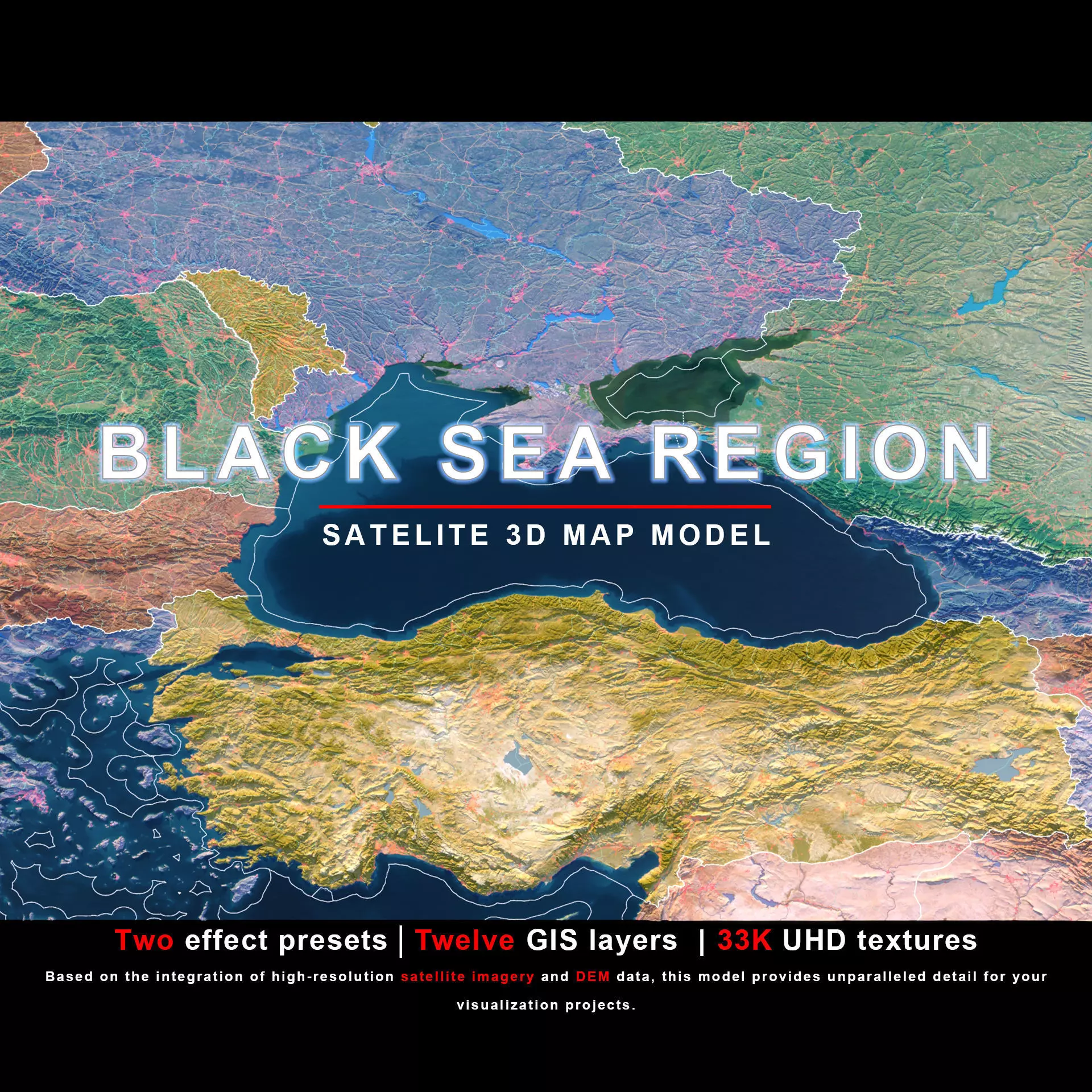 The model includes satellite imagery and masks. The masks are primarily used in material blending to adjust the material representation based on different geographical data. We provide texture maps in both 8K and 33K resolutions.