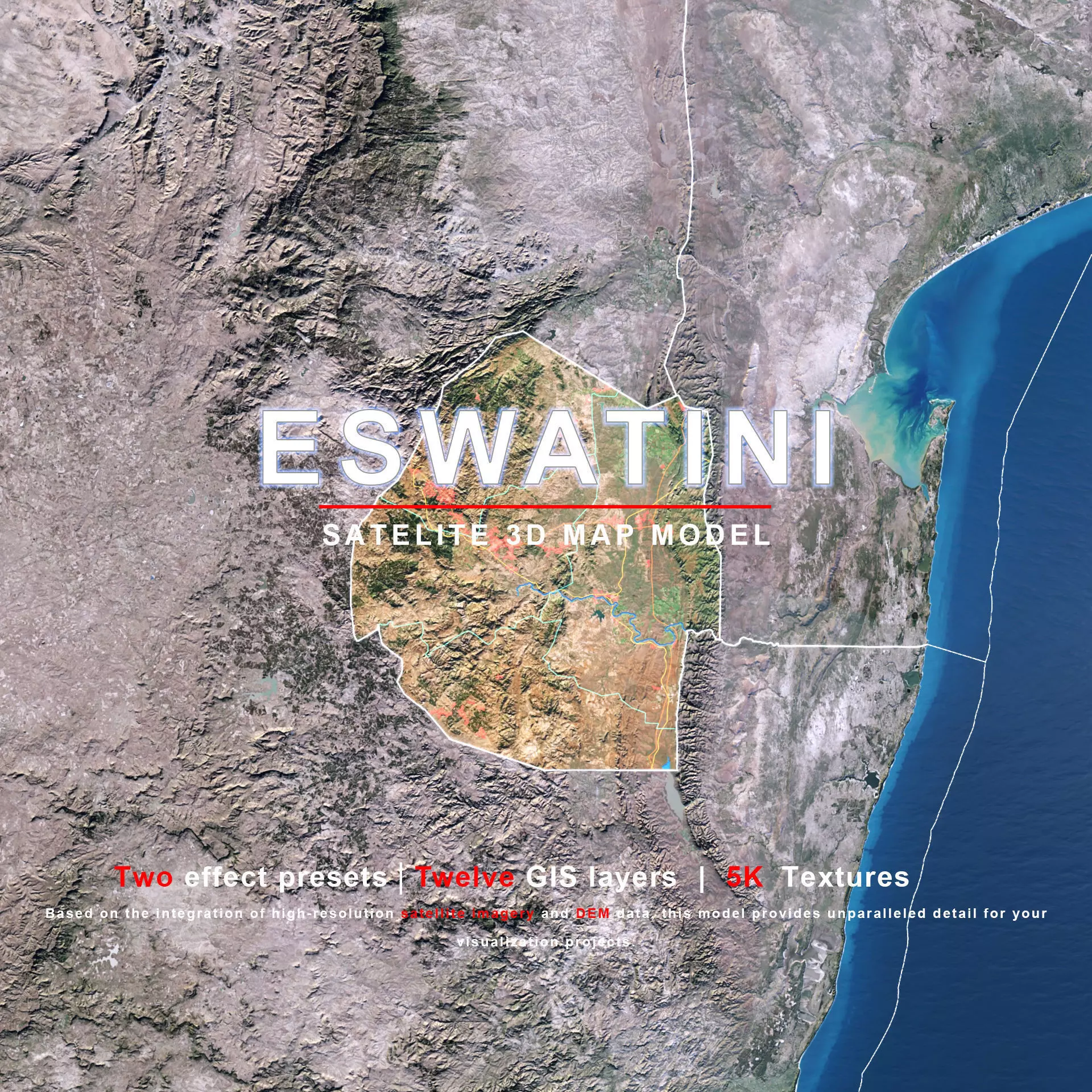 The model includes satellite imagery and masks. The masks are primarily used in material blending to adjust the material representation based on different geographical data. We provide texture maps in 5K resolutions.