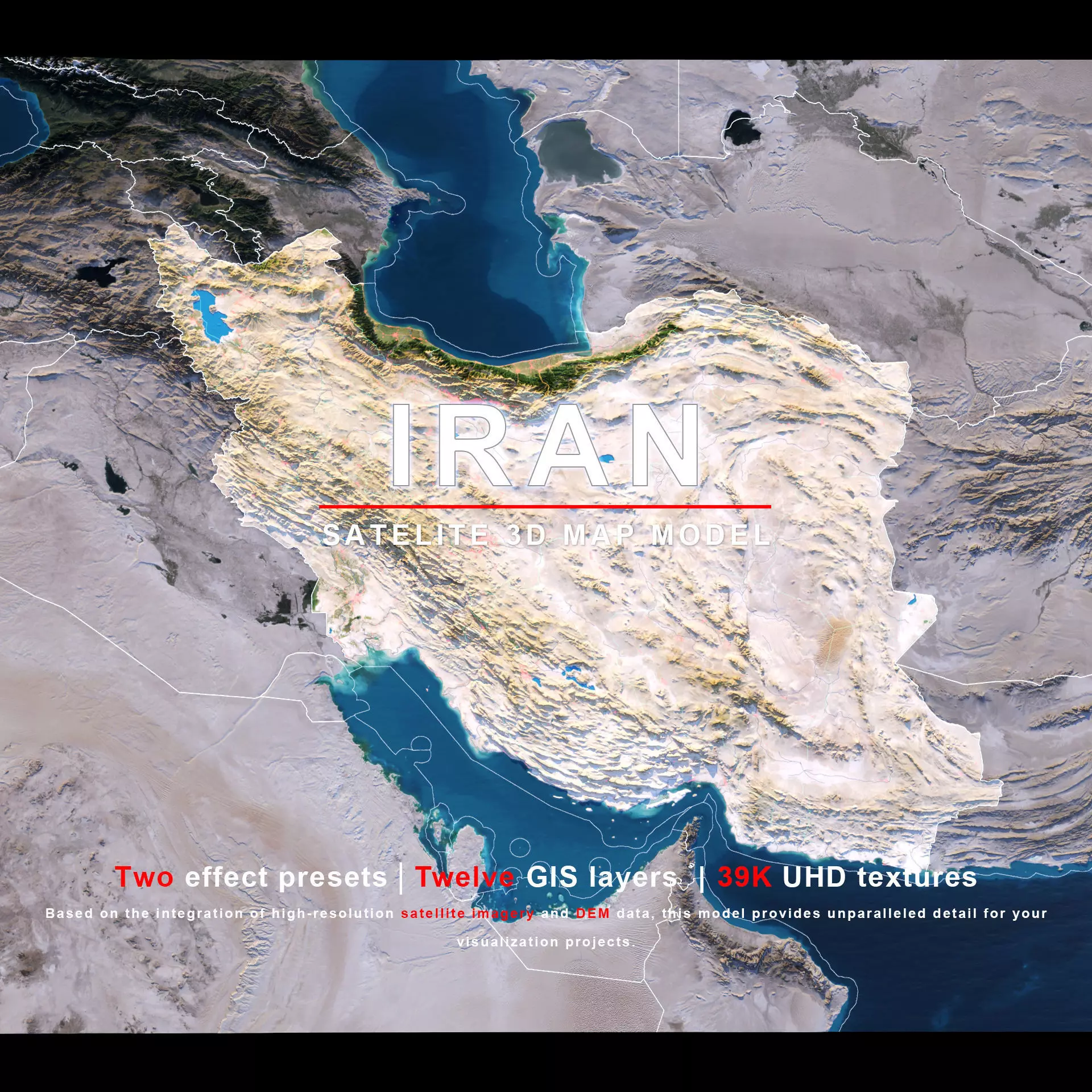 The model includes satellite imagery and masks. The masks are primarily used in material blending to adjust the material representation based on different geographical data. We provide texture maps in both 8K and 39K resolutions.