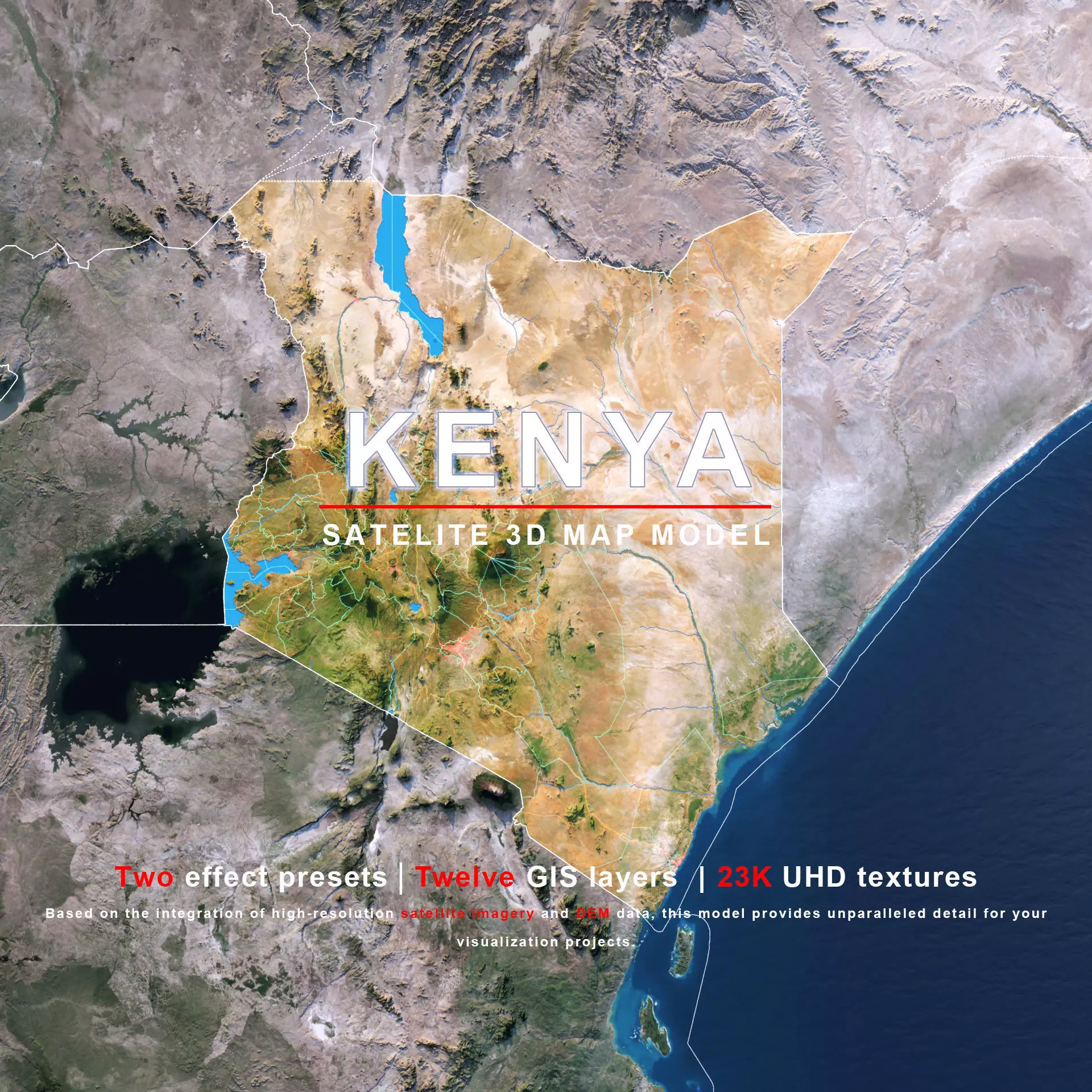 The model includes satellite imagery and masks. The masks are primarily used in material blending to adjust the material representation based on different geographical data. We provide texture maps in both 8K and 23K resolutions.