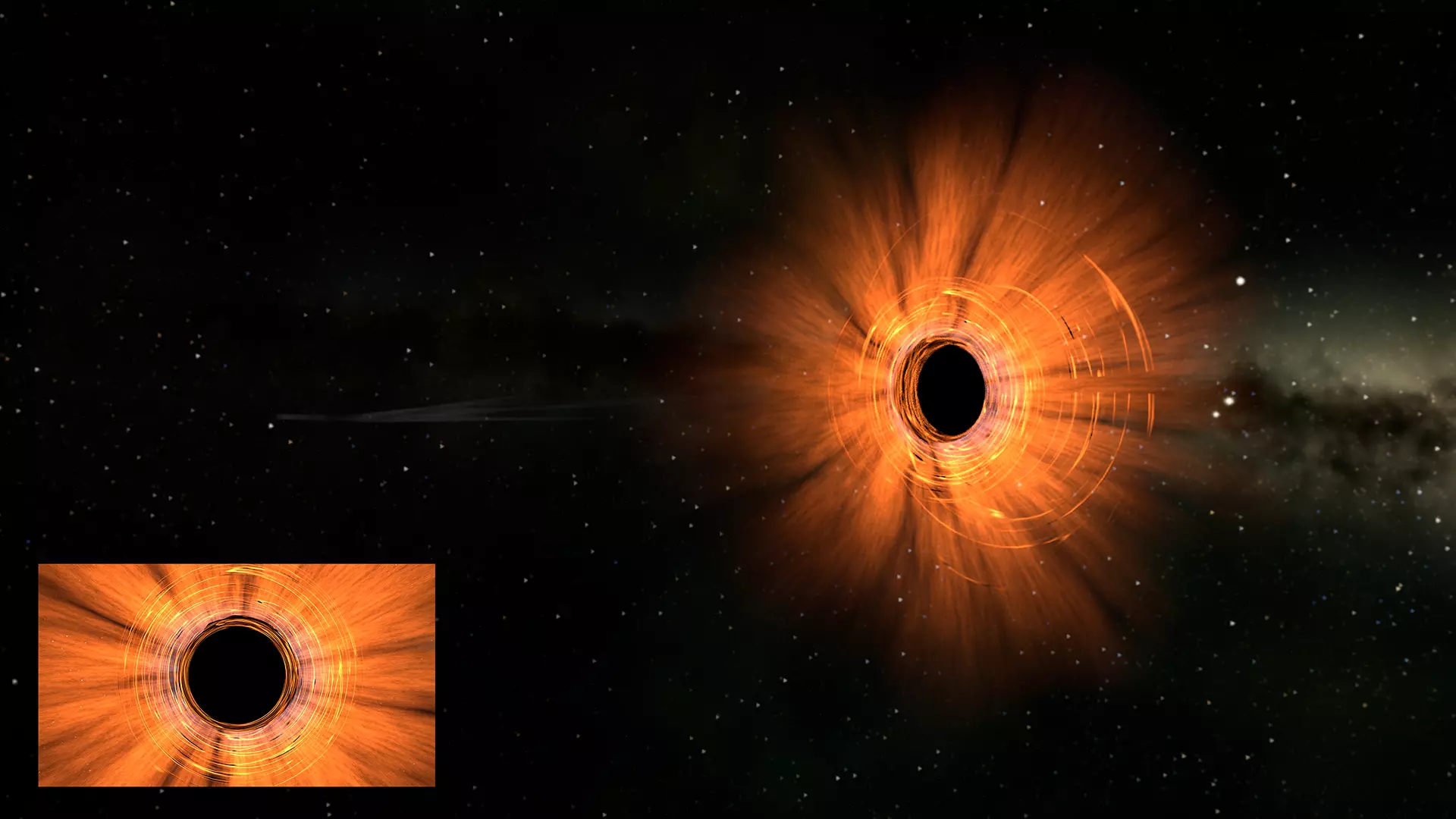 The scene is animated and (except from the HDRI provided for the background), everything is procedural : Which allows you to film from far or close distance to the black hole and preserve the image quality and resolution.