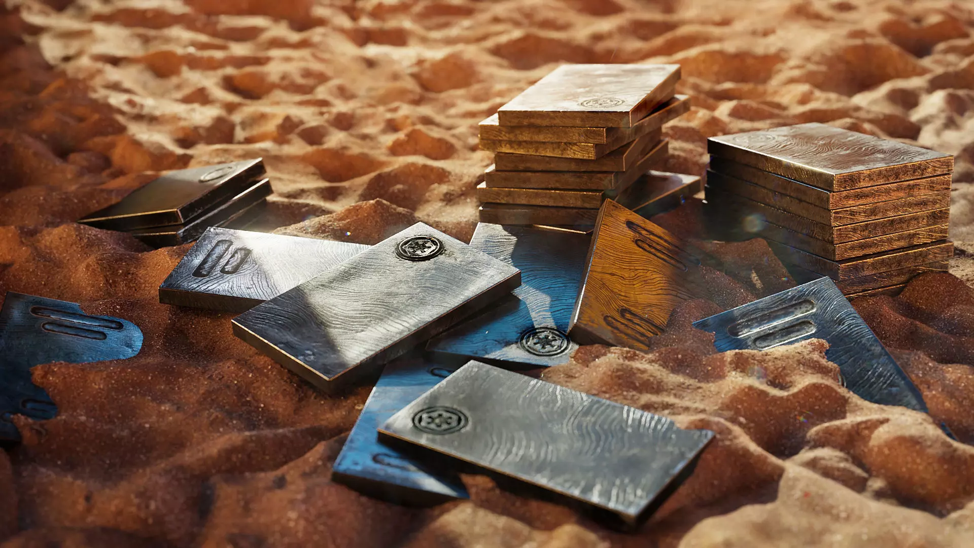 This set of Beskar Steel ingots is close to the show prop from The Mandalorian but also allows for some custom design by attaching the included imperal seal everywhere you want.You will find two PBR materials for the ingots included, one with the typical damascus steel look and one with a worn imperial anthracite coating, as you can see in the previs renderings.