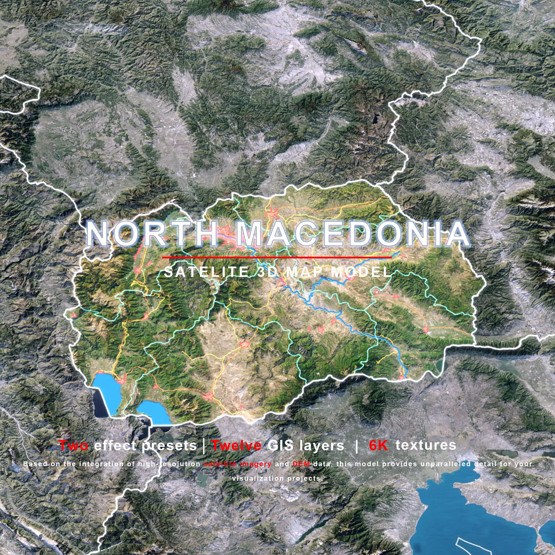 The model includes satellite imagery and masks. The masks are primarily used in material blending to adjust the material representation based on different geographical data. We provide texture maps in 6K resolutions.