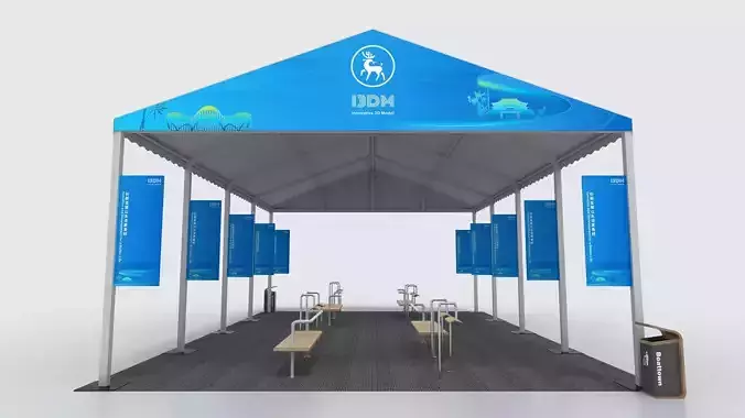 This is a 3D model of an outdoor sunshade canopy designed for use in waiting areas at outdoor events, conferences, or bus stops. The dimensions are based on real-life measurements (10.9m length × 7.5m width × 4.9m height), making it suitable for providing shade and rain protection. The model is low-poly, ensuring minimal impact on computer resources, and can be easily modified after download.