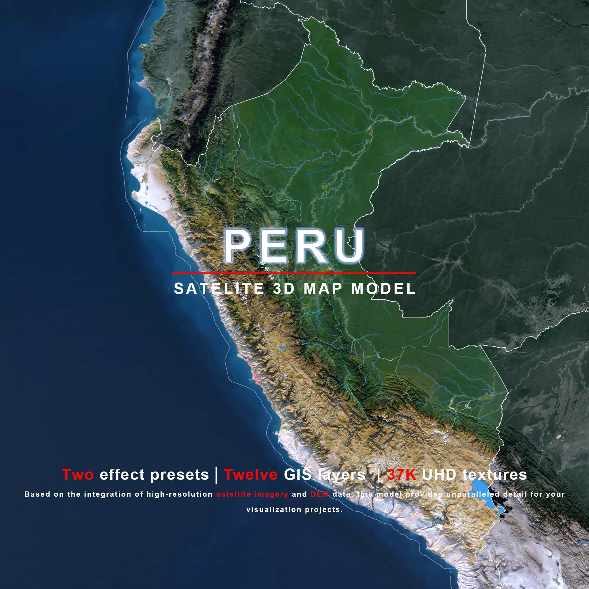 The model includes satellite imagery and masks. The masks are primarily used in material blending to adjust the material representation based on different geographical data. We provide texture maps in both 8K and 37K resolutions.
