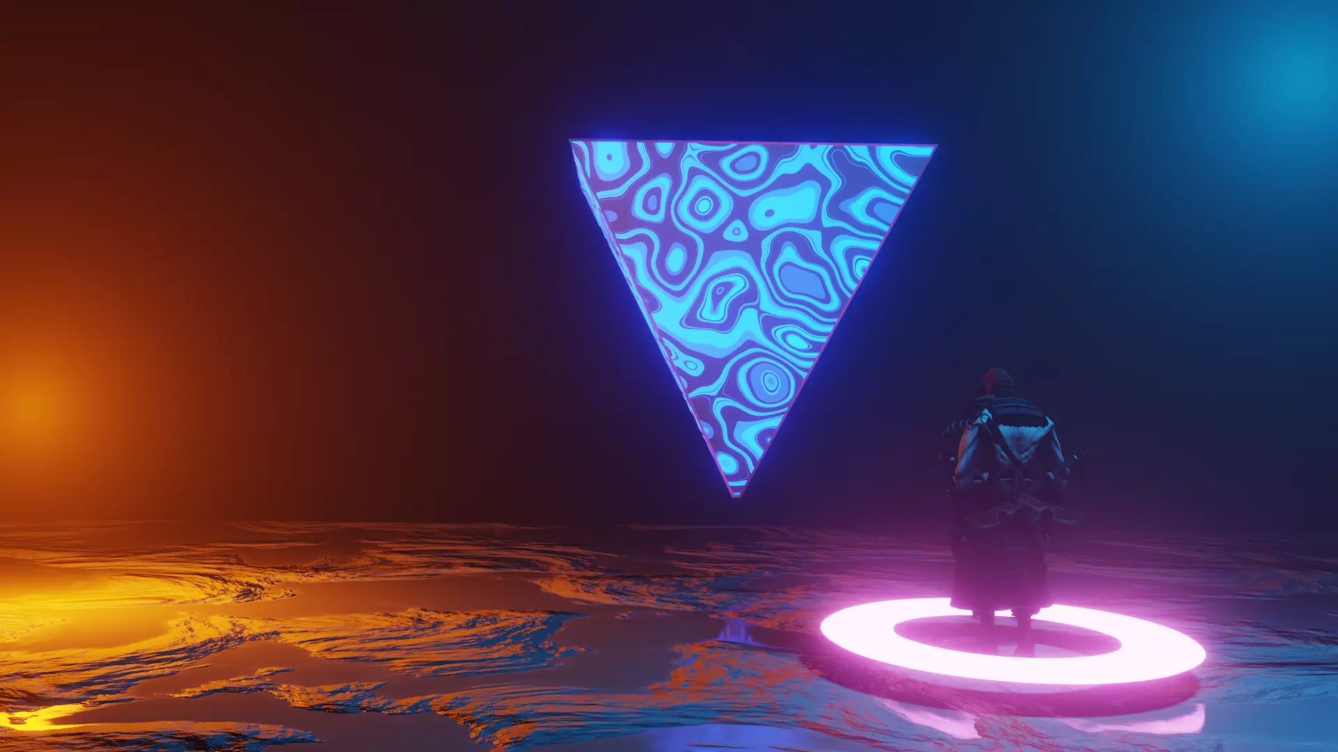 High-quality stylized sci-fi environment featuring a glowing neon triangle with abstract emissive textures, cinematic orange-blue lighting, and a reflective futuristic surface. Perfect for use in games, animations, wallpapers, and concept art.