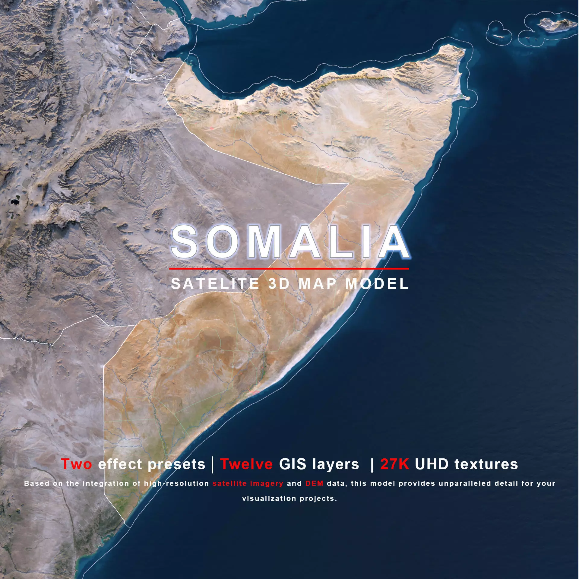 The model includes satellite imagery and masks. The masks are primarily used in material blending to adjust the material representation based on different geographical data. We provide texture maps in both 8K and 27K resolutions.