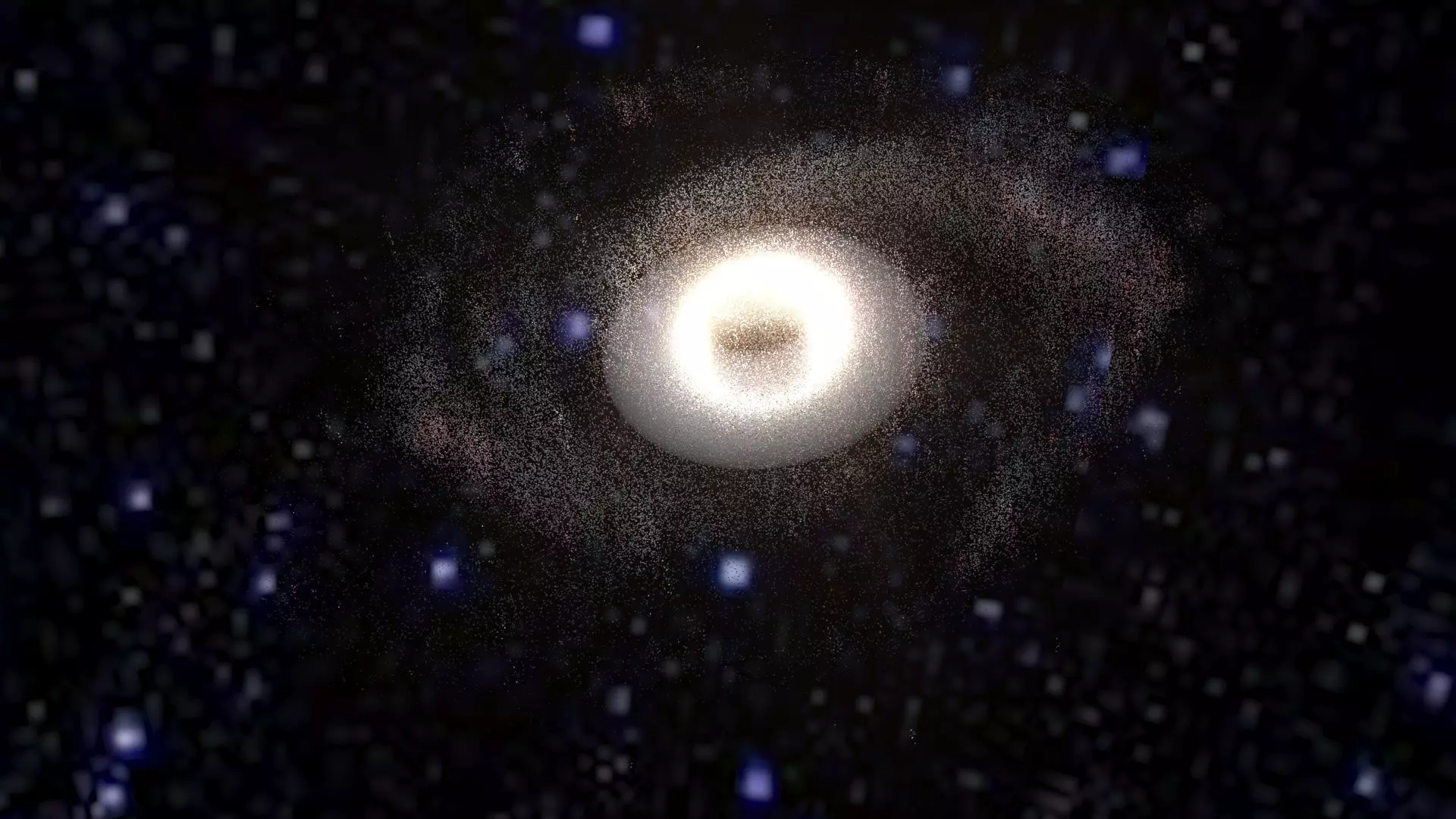 Model is a set of particle systems with elements of different types. Since real Whirlpool Galaxy contains hundreds of billions stars, there are no way of simulate realistic view of galaxy directly. So here used textured particles with complex materials, placed along structural parts of Galaxy. Some of them are “clouds” of stars, others are light absorbing dust, emitting hydrogenous clouds, individual super-giant stars, etc. Multi-layered complex shaders was specifically designed to retain detailed and realistic view with extreme closeup and inside-the-galaxy views