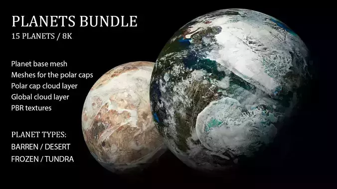The sphere of the planet is unwrapped, and has visible texture seams in both poles. There are two unwrapped identical models laid on top of these areas on both poles, and textures are provided to give idea of frozen polar caps. The pole model is unwrapped and any other texture can be applied to it. There is also a cloud layer covering the entire planet, and two identical cloud layers on top of the poles. All of the mentioned features are provided as a single FBX file. The project file contains 2 additional cloud layers.