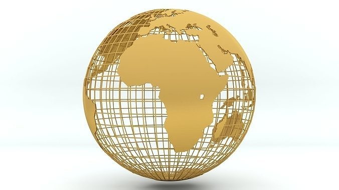 A golden earth globe model on top of a golden lattice sphere. The first in a set of 3 globe models I've created.