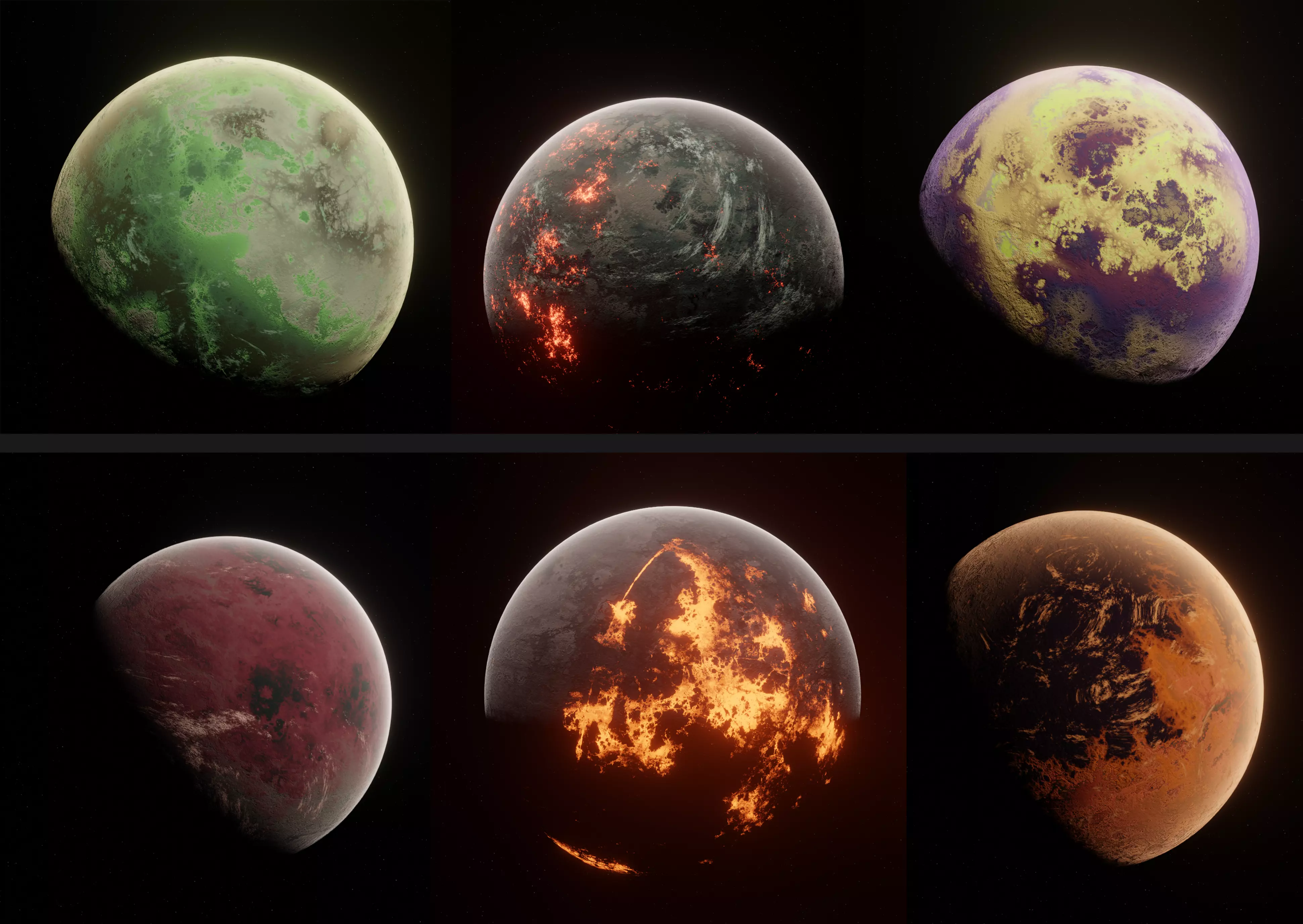 These planets were created in Blender 3D. The landscape and atmosphere and clouds are program materials and created using nodes and shaders.