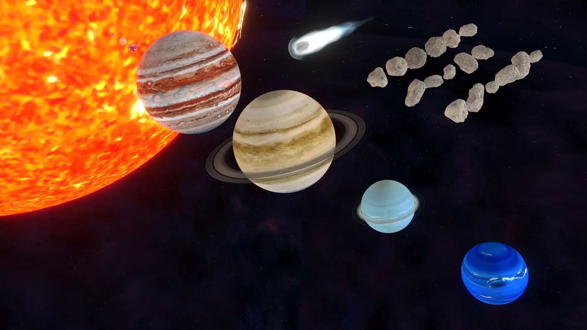 Planets in real scale (except asteroid and comets)Different types of Asteroids for enviroment desingPerfect for a space explorer explanation or strategy game.