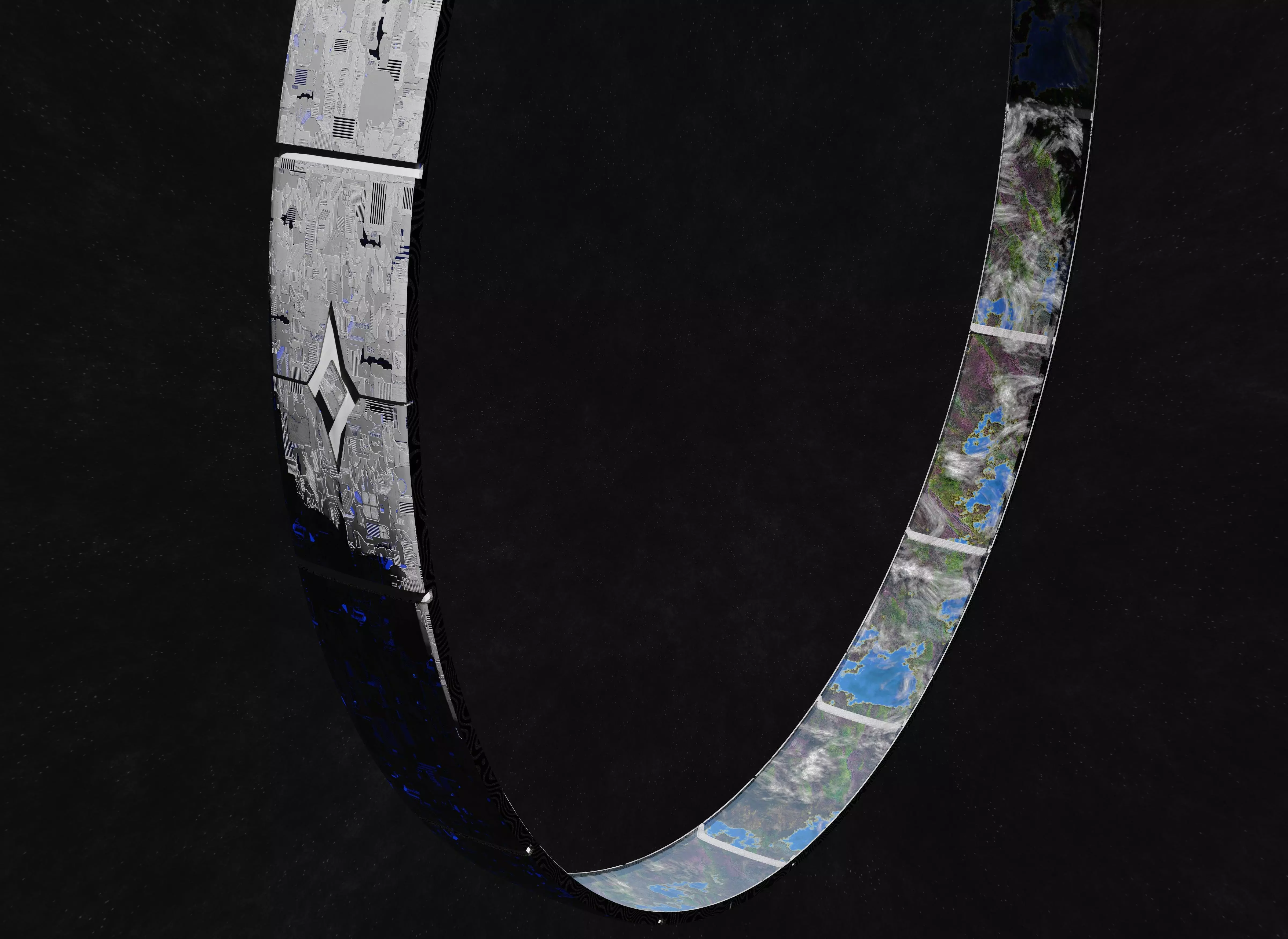 Lore and science behind the space habitatThis space station/space habitat is a ring shaped construction of approximately 5 km in diameter. By rotating it creates centrifugal force capable of simulating gravity. This simulated gravity feels so real that this station does not even needs to be fully enclosed to hold its atmosphere. As long as the rims are high enough, this ring will hold on to its atmosphere just like a planet would. The size of this station would provide an extremely large amount of living area for future humans. Just the surface alone could house at least a billion people. on top of that, the rims that hold the atmosphere double as living area as well, allowing for apartments with a perfect high-rise type of view over the surface of the ring world.In order to create a construction of this grandeur would take a lot of construction work and can be considered unreachable in this century or even the one after this. Even so, even with current level of technology a construction like this is possible to be build. Even although a construction like this would be under a lot of stress from its rotation, by using a combination of our strongest materials and forms of active support, a ring like this can be build without needing any form of sci-fi explanation or new technologies. So one could say that it is only a matter of time until humanity will build one of these.