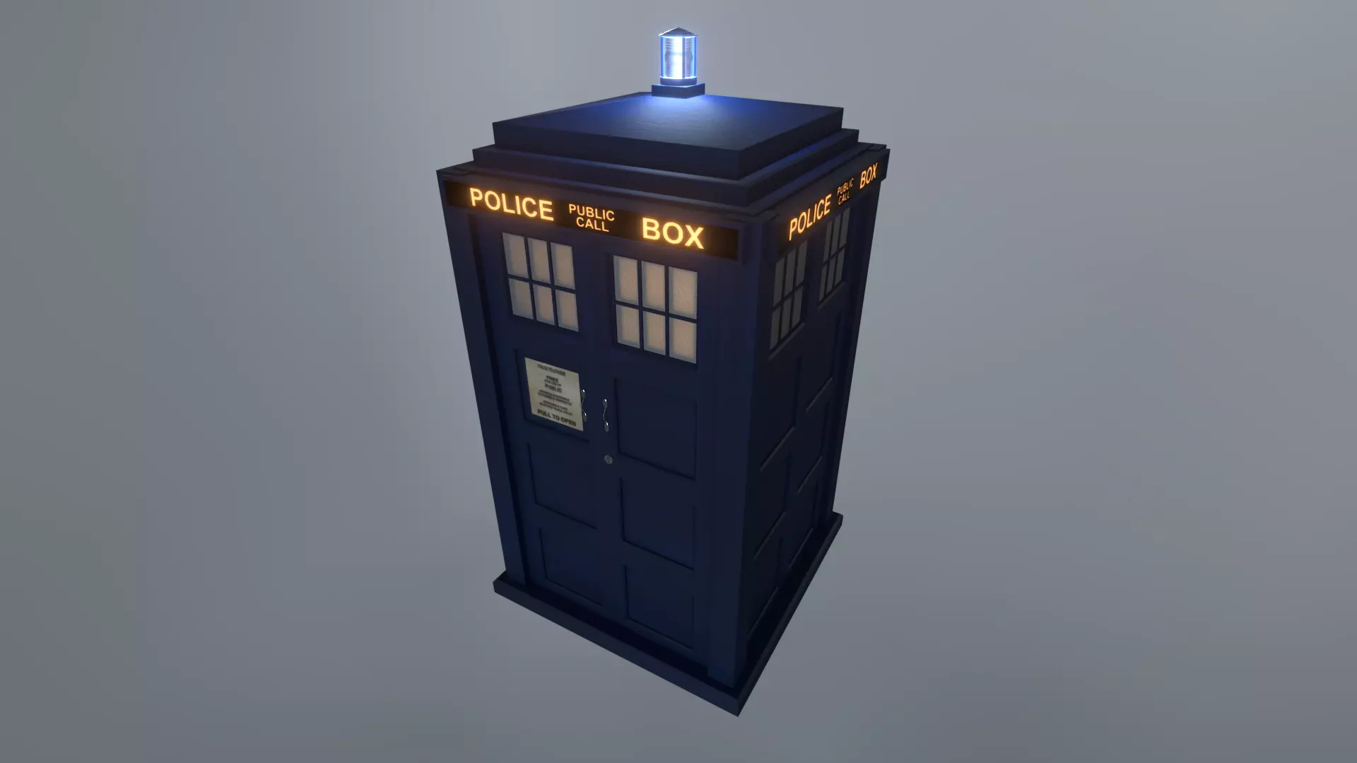 Travel through Time and Space with your very own Matt Smith era Tardis! The model is designed for a semi photorealistic appearance with a bump, roughness, and specular maps to properly reflect light. (It is still worth noting that good 3 point lighting and volumetrics is needed for realism in general.) They are rigged and textured by I and have lights that can be removed, changed in colour or simply be deactivated. The Textures consists of a colour map (switch to black and white setting for heightmap) with a Principled shader that automatically generates accurate, well-detailed bumps, reflections and highlights. For the sake of realism, separate light planes are placed behind two layers of frosty windows, resulting in more realistic light patterns as they fade from side to side.