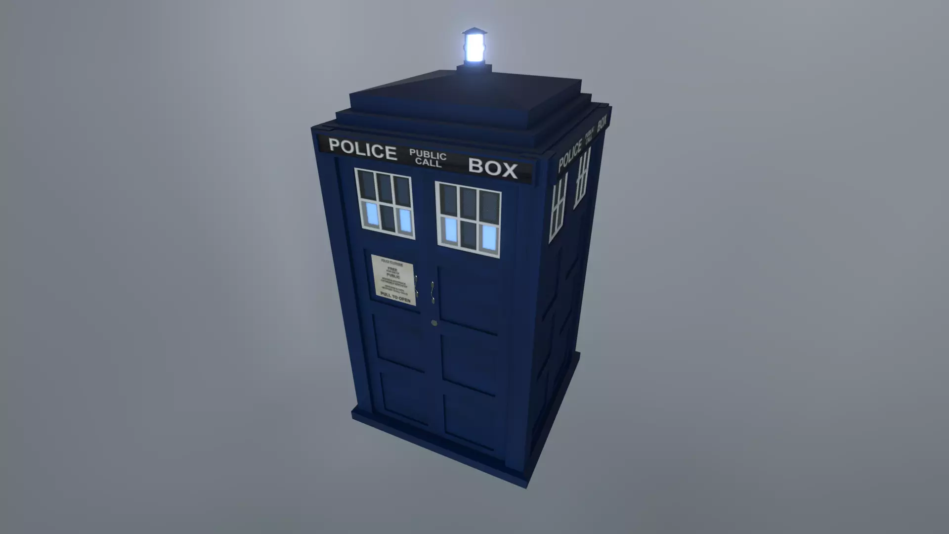 Travel through Time and Space with your very own Matt Smith era Tardis! The model is designed for a semi photorealistic appearance with a bump, roughness, and specular maps to properly reflect light. (It is still worth noting that good 3 point lighting and volumetrics is needed for realism in general.) They are rigged and textured by I and have lights that can be removed, changed in colour or simply be deactivated. The Textures consists of a colour map (switch to black and white setting for heightmap) with a Principled shader that automatically generates accurate, well-detailed bumps, reflections and highlights. For the sake of realism, separate light planes are placed behind two layers of frosty windows, resulting in more realistic light patterns as they fade from side to side.