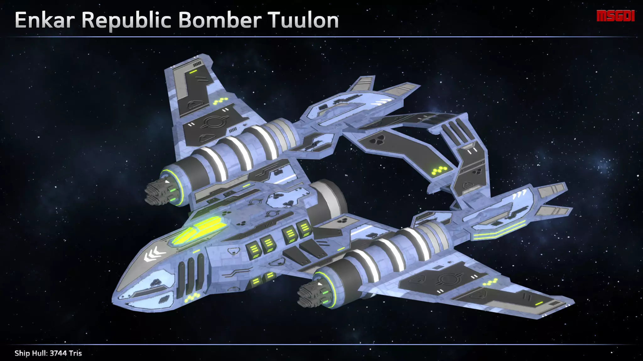 This pack contains a Tuulon bomber of the Enkar Republic with weapons. It can be used in space RTS games or as an end boss in a sidescroller game. It can also be used in a top-down or 3rd person shoot’em up.