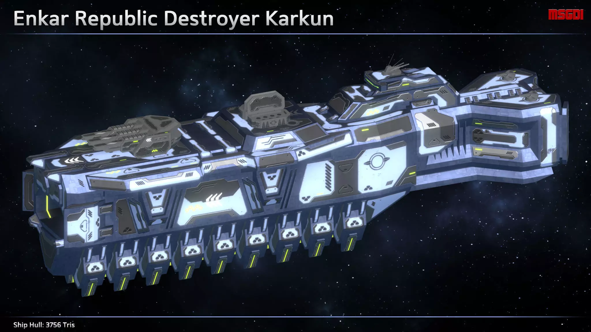 This pack contains a Karkun destroyer of the Enkar Republic with weapons. It can be used in space RTS games or as an end boss in a sidescroller game. It can also be used in a top-down or 3rd person shoot’em up.