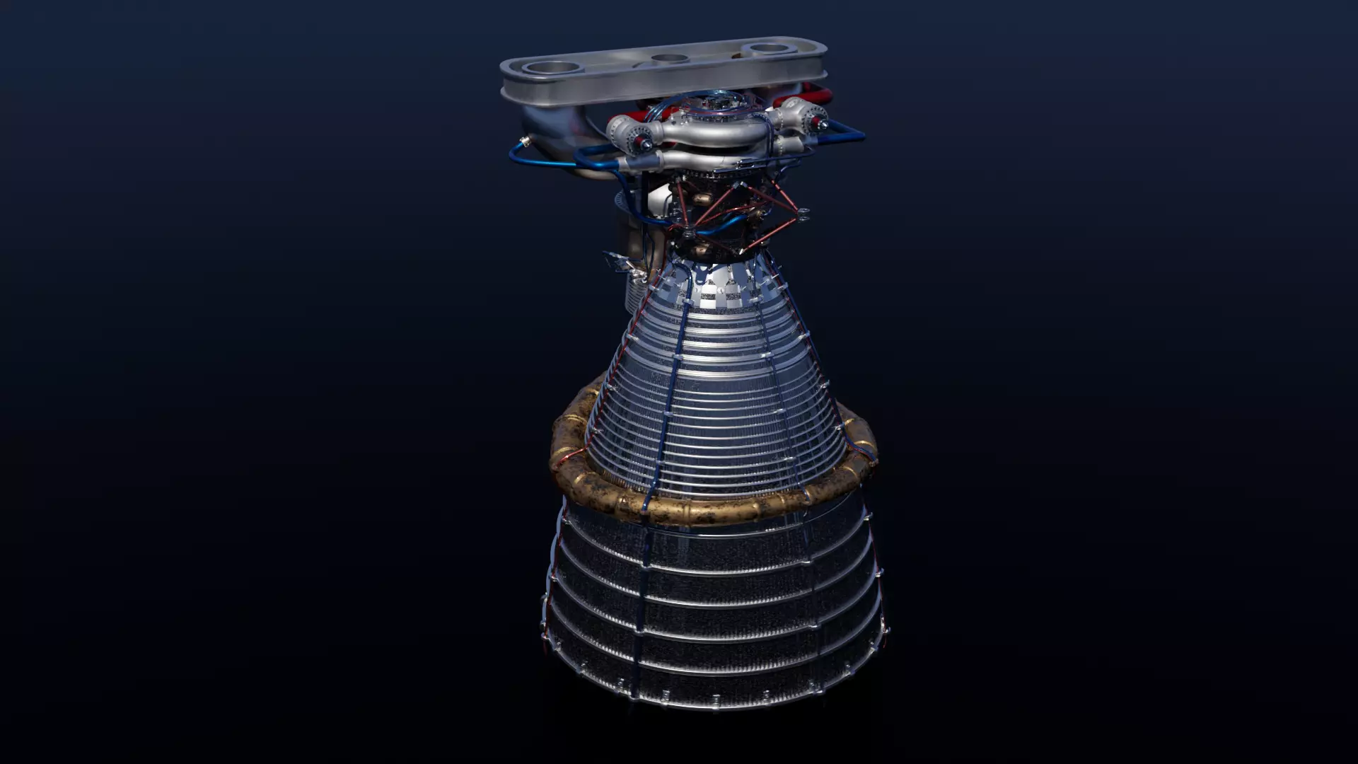 This is a model of the F-1 rocket engine used on the first stage of the Saturn V. It is a rather high poly version and mostly meant for closeups or for reference of the basic shape.As you can see the model does not include the insulation layer of Inconel foil and Asbestos insulation layer that the engines would usually be covered with. I thought it might look better for most renders that don't go for 100% realism but it's definitly something that I will model in the near future.I made it with the subd workflow in Blender. All the modifiers are already applied. All of the major components of the Engine are modeled while some of the wiring and other smaller details that would take up a lot more poligons are not modeled. As it is however the model is standing at 5 million poligons and isn't that lightweight on it's own.