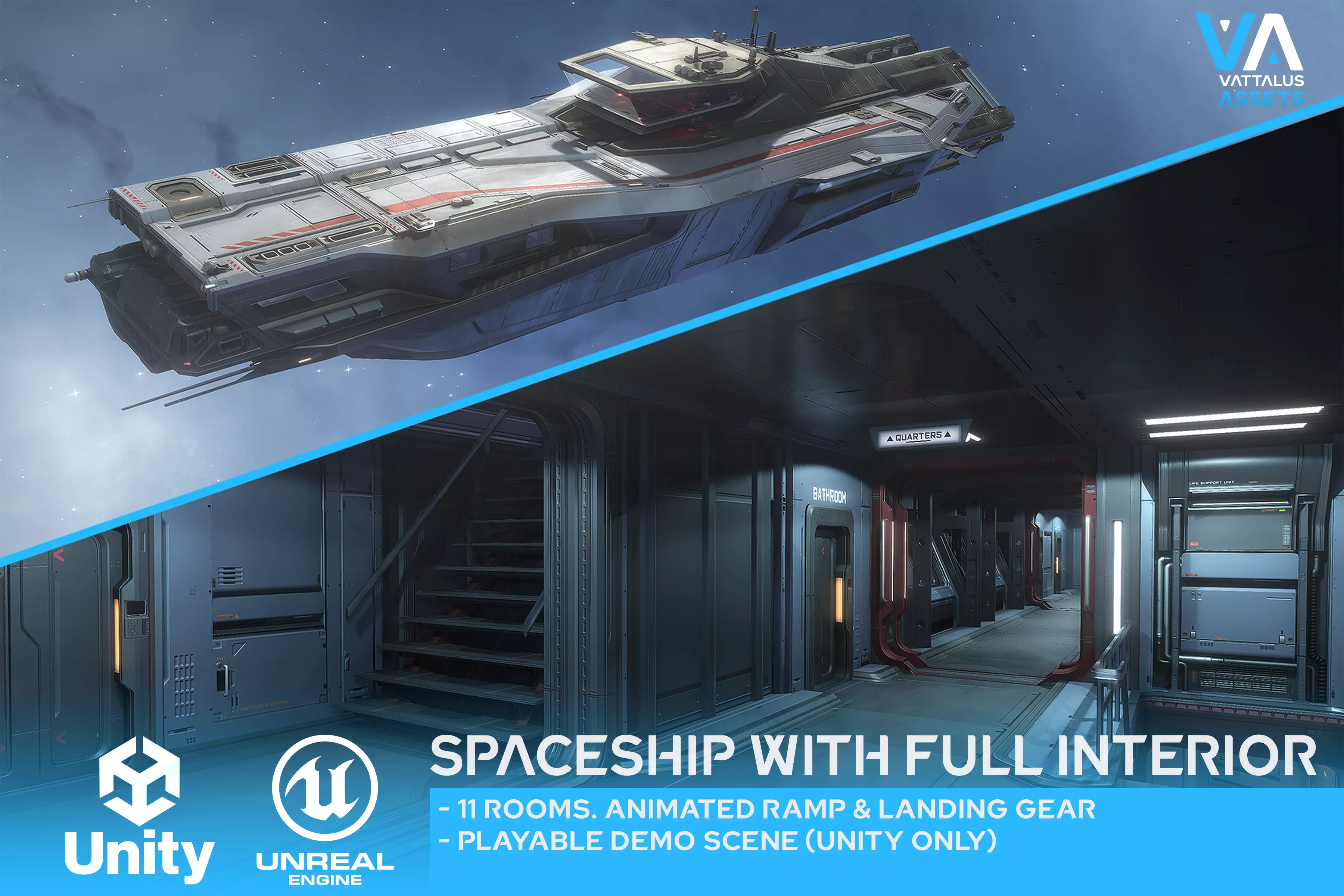 A large spaceship with fully detailed interior, animated landing gear and cargo ramp. This versatile package is suitable for a vide variety of Sci-Fi games/experiences. It can be your hero ship with which you explore the galaxy, set dressing for a sci-fi level in which you do gameplay activities in the landed/derelict ship interior. Or use the ship as your backdrop for your animated story. The various interior rooms together with the customizability of materials and atmosphere offer countless gameplay opportunities.