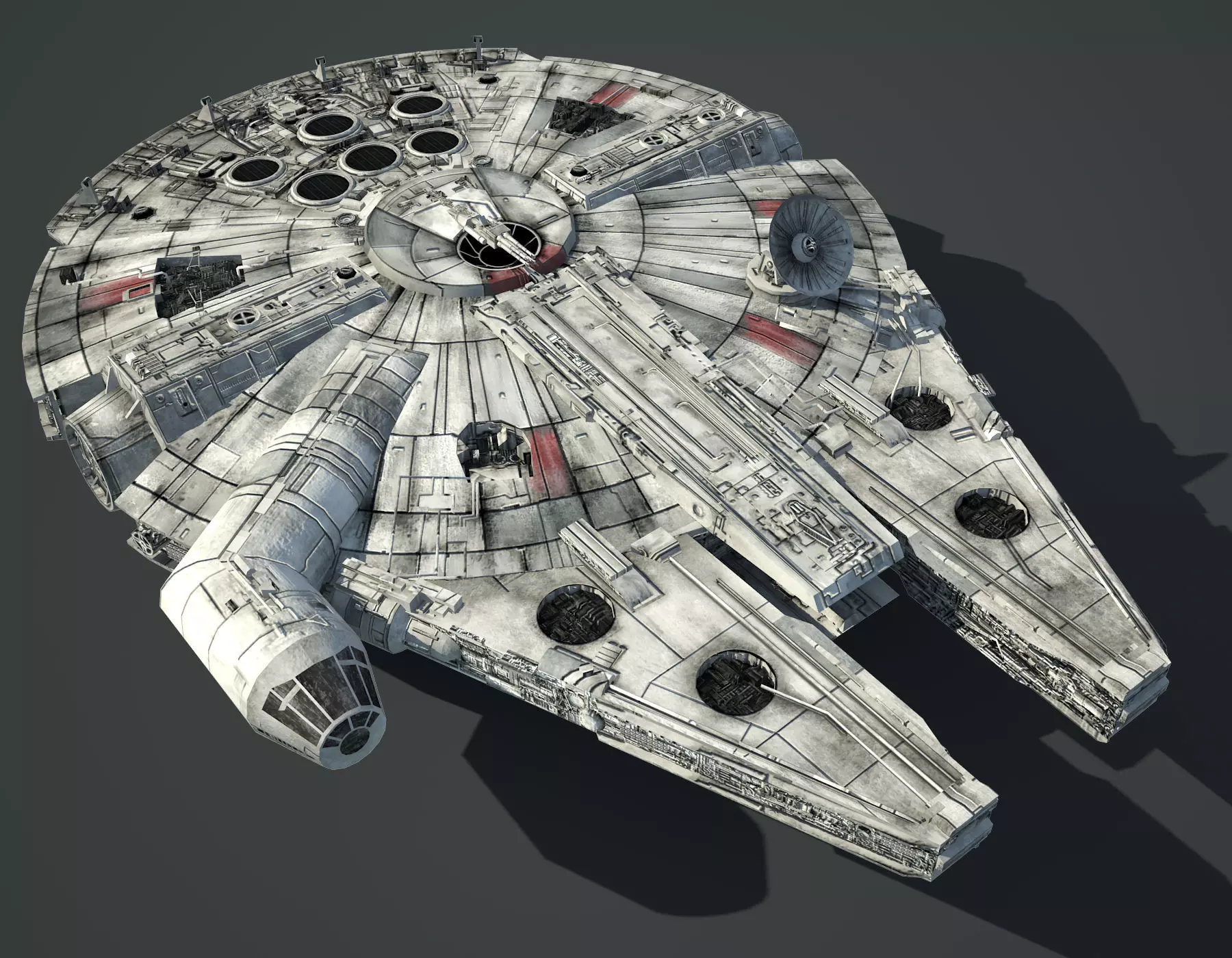 Game Ready Star Wars Millennium Falcon ship, originally modeled in Maya. This is a canon model based on the physical ILM Millennium Falcon sets. *Bonus download of three LOD models - LOD1, LOD2, LOD3.
