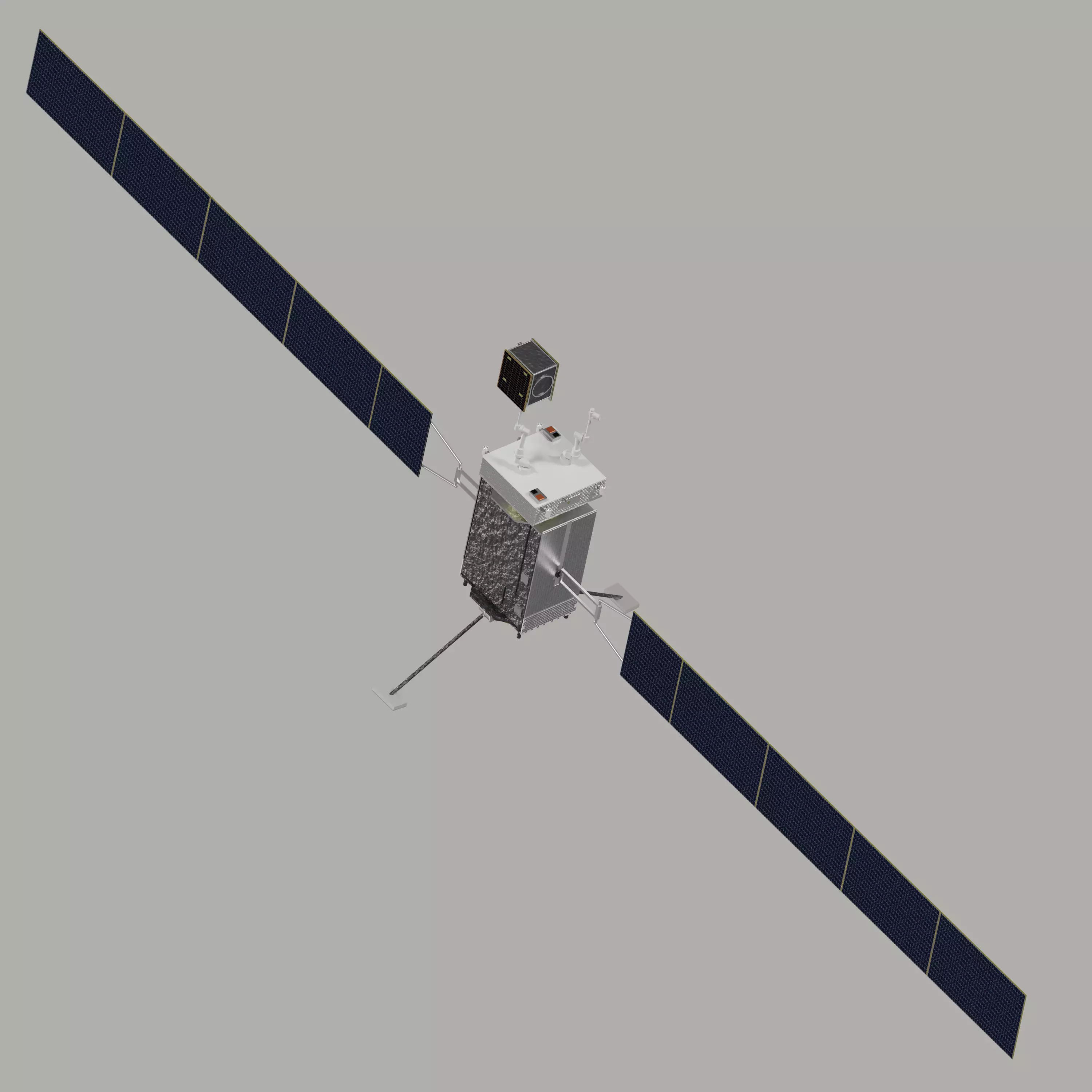 Northrop Grumman's Mission Robotic Vehicle satellite servicer, designed to support aging geosynchronous orbit satellites past their original end-of-life. MRV is a follow-on to their already-flown Mission Extension Vehicle, but instead of the entire spacecraft docking semipermanently to the client satellite, it serves as a delivery system for a more specialized Mission Extension Pod providing only propulsion services (MEP is included in this model). MRV and MEV are both built on the same GEOStar-3 spacecraft bus, but with different equipment modules. MRV is intended primarily to serve the GEO comsat market