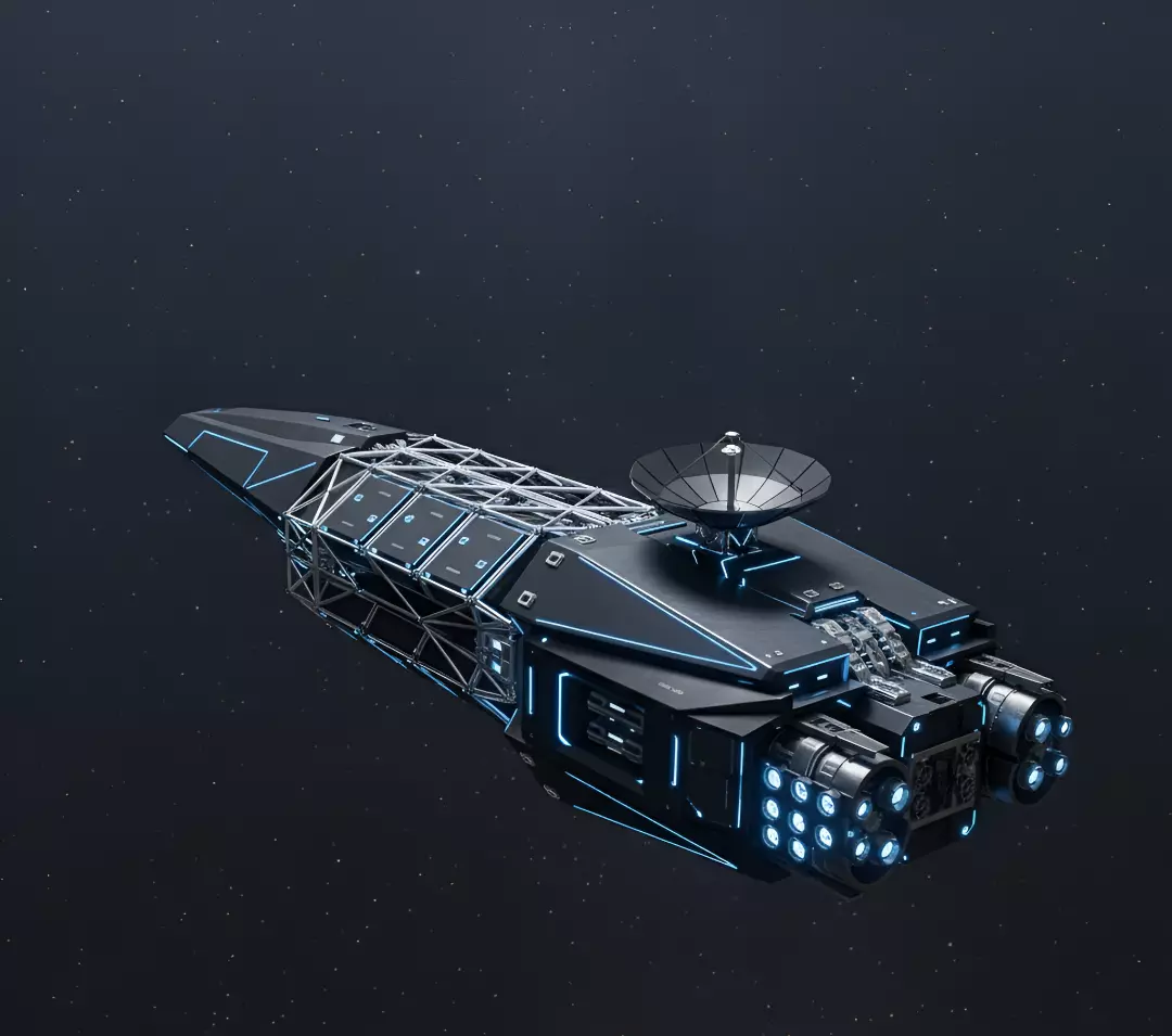 The design features a dark, matte black hull accented by striking neon blue lighting outlining various structural elements and windows, giving it a high-tech, functional look. A significant portion of the ship's mid-section utilizes an exposed skeletal framework, suggesting a modular or heavy-duty construction for cargo transport or structural reinforcement. Prominently mounted on the upper hull is a large satellite dish, indicating communication or sensor capabilities. The rear of the ship features multiple powerful engines with bright blue glowing thrusters. This asset is ideal for visualization, games, or film projects requiring a robust, realistic-looking hard sci-fi capital ship.