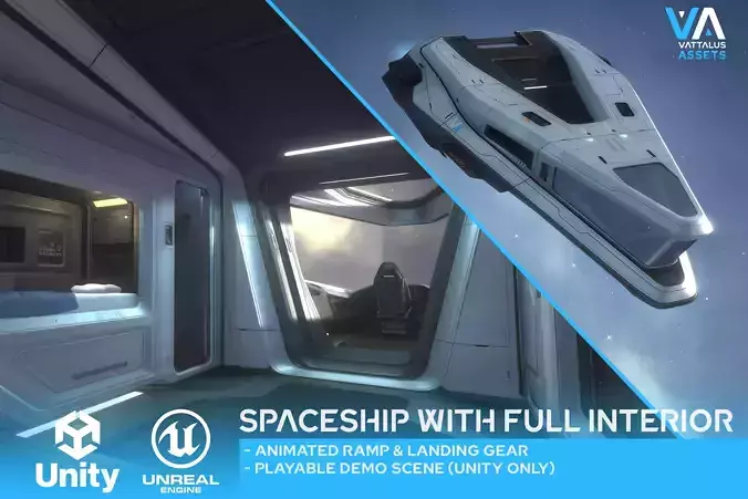 This is a highly detailed spaceship model with an elegant cockpit and fully realized interior spaces, with interactable elements such as cupboards, doors, sliding computer racks etc.It offers a fully interactive environment to immerse your players in, perfect for any space simulation games, space exploration games or VR experiences.