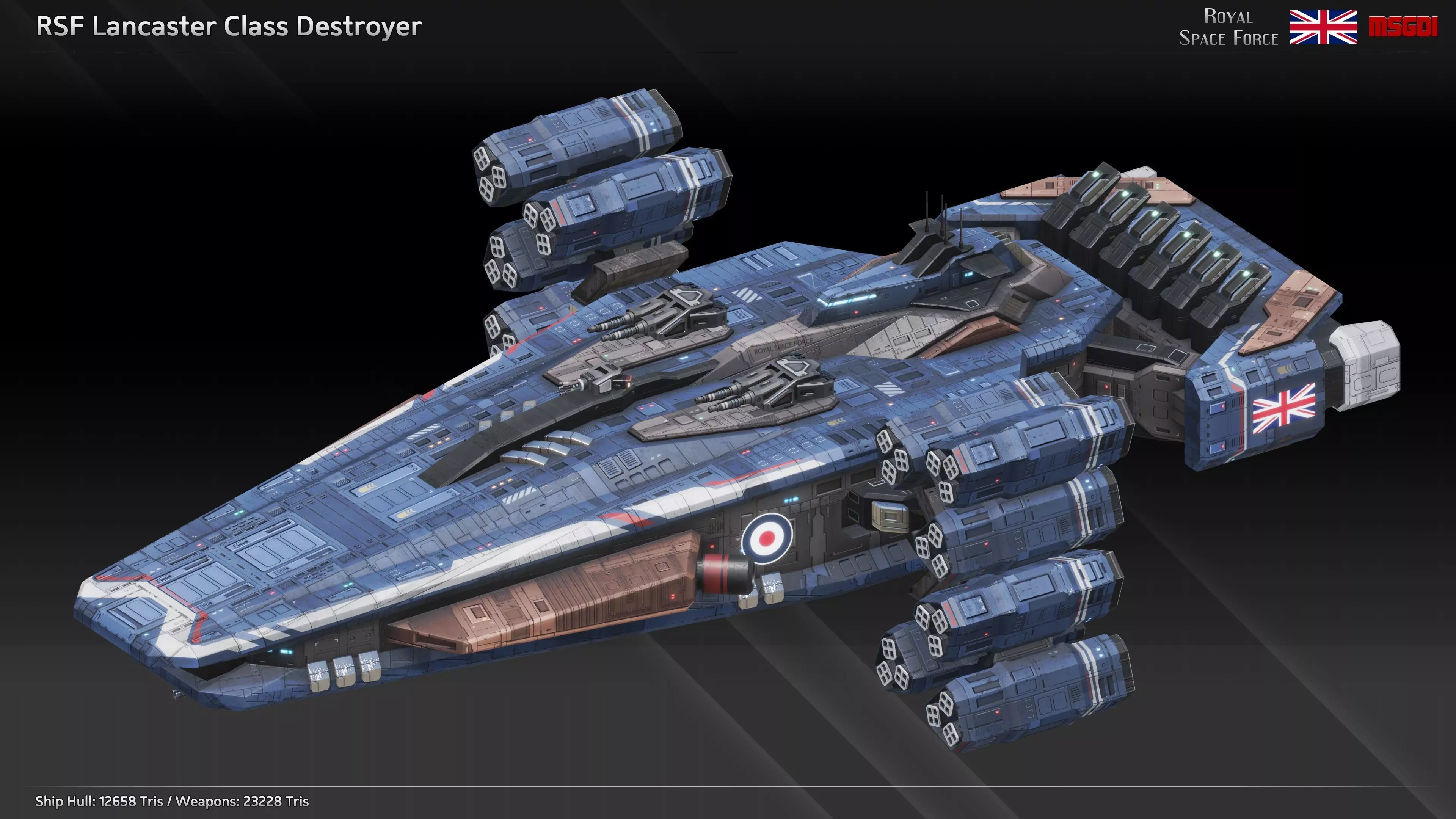 This pack contains the Lancaster class destroyer of the Royal Space Force with modular weapons. It can be used in a space themed game.