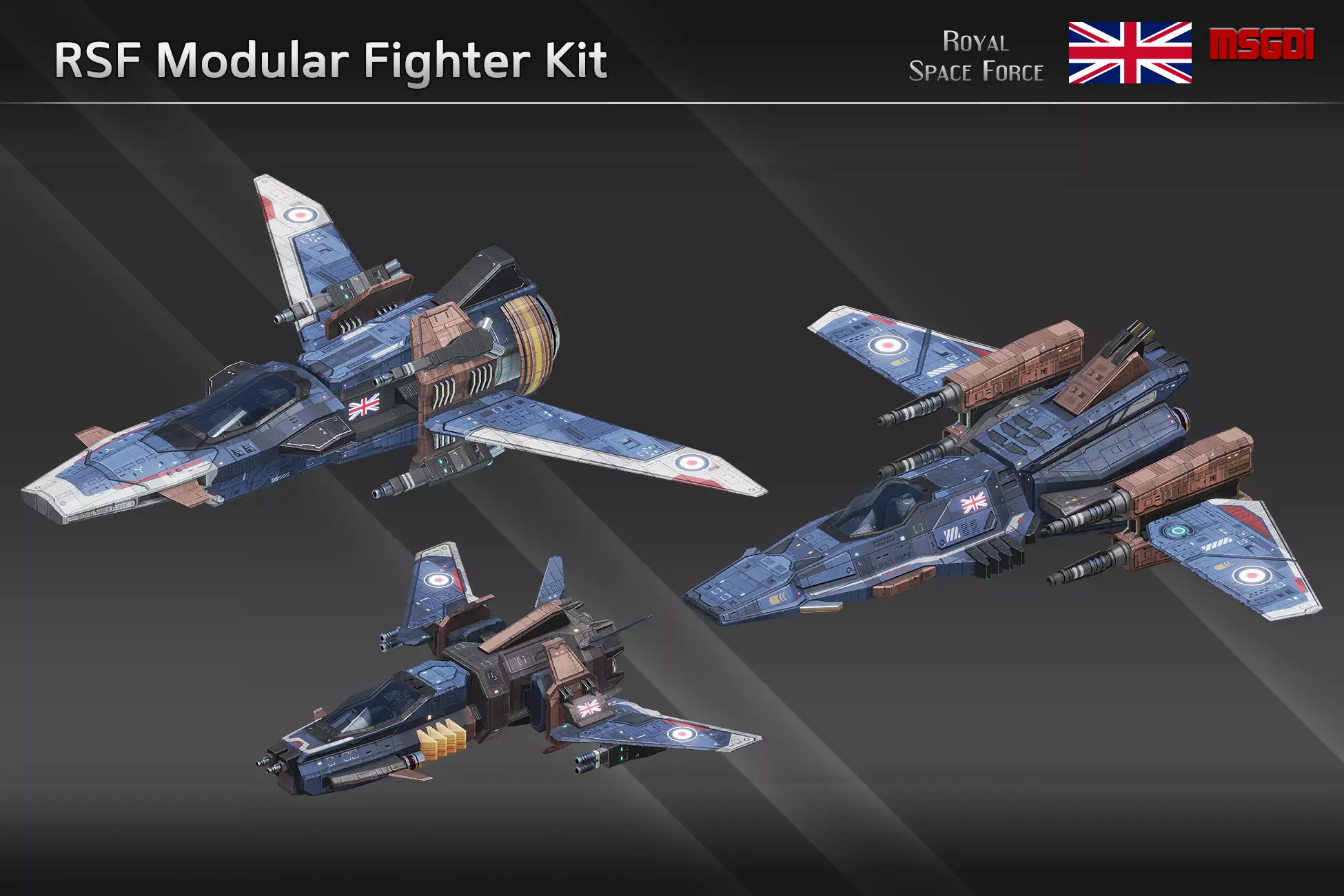 This pack contains the modular scifi fighter kit of the Royal Space Force with modular weapons. It can be used in a space themed game.